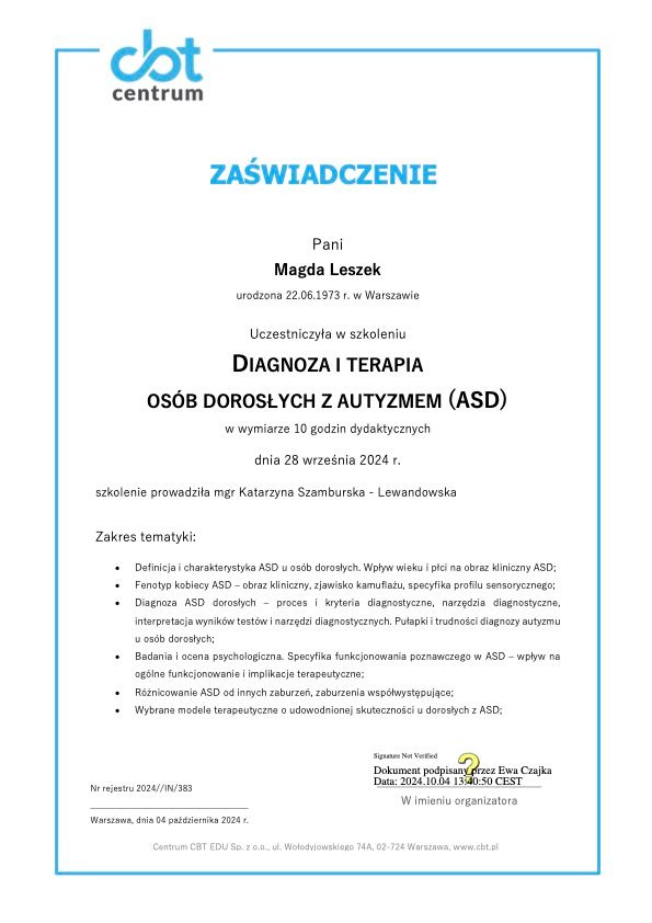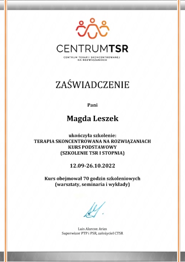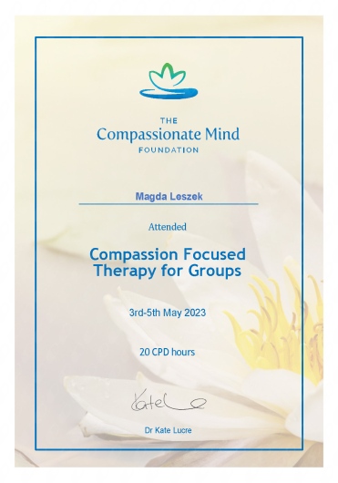 Bardzo polecam Panią Magdę, gdyż to wspaniała specjalistka, posiadająca ogromną wiedzę o człowieku i potrafiąca udzielić rzeczowego wsparcia w kryzysowych sytuacjach. Atmosfera na spotkaniach jest zawsze cudowna.