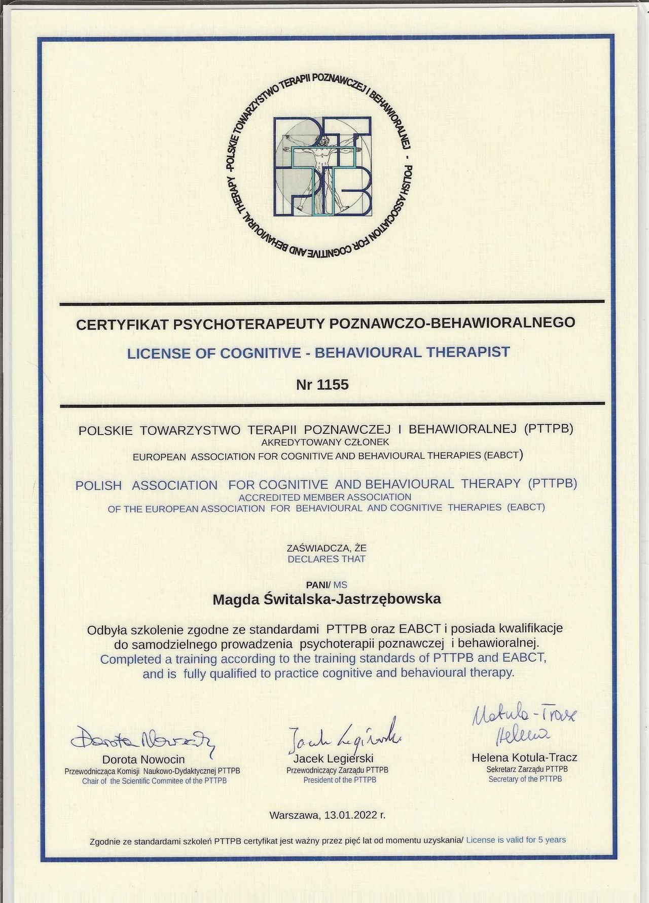 Jestem psychologiem oraz certyfikowaną psychoterapeutką poznawczo – behawioralną (certyfikat PTTPB nr 1155).
