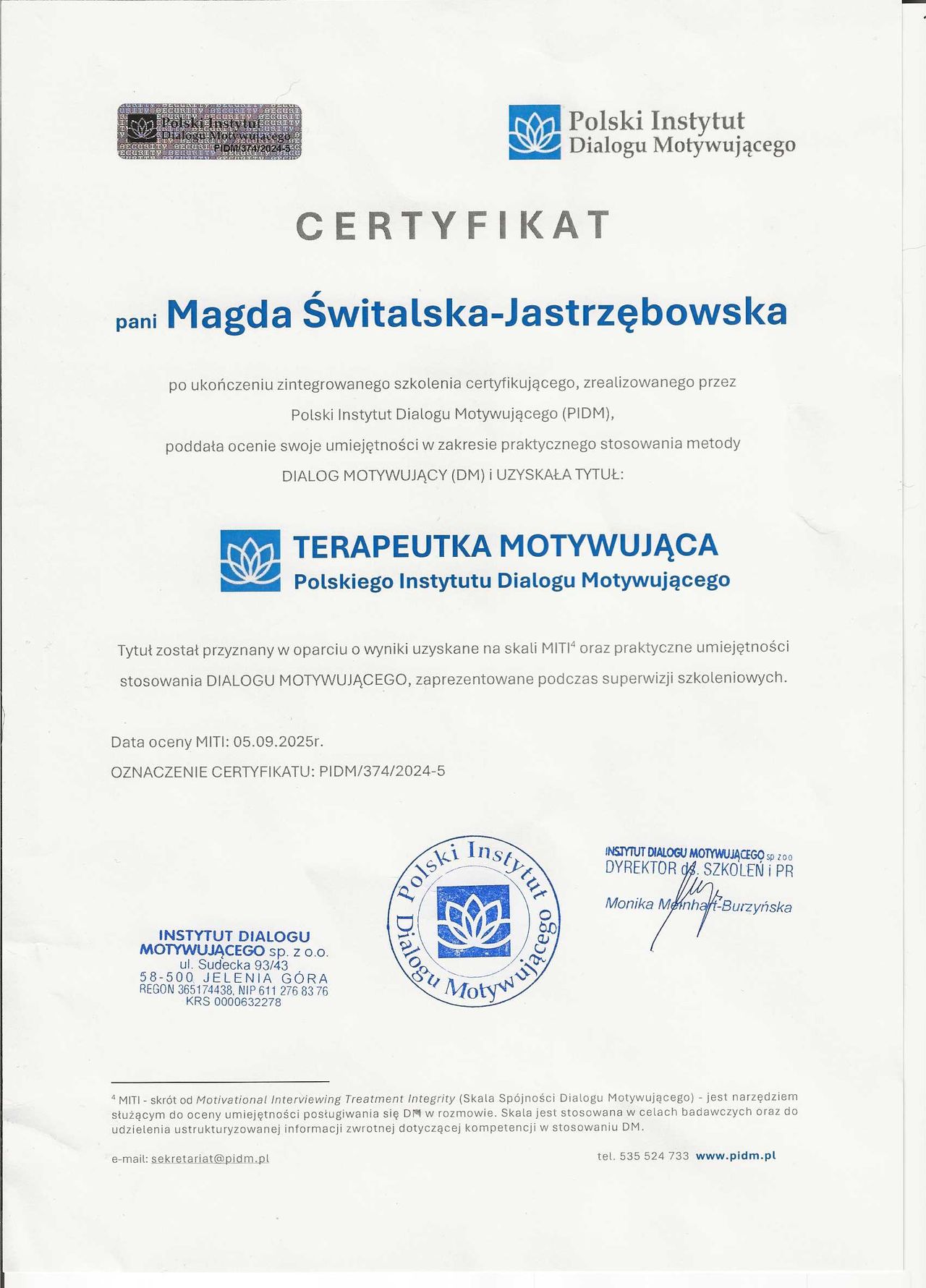 Posiadam certyfikat Terapeutki Motywującej, nadany przez PIDM.