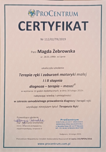 Pani Magdą ma świetne podejście do dzieci, a pomysłów na motywowanie dziecka do pracy ma bardzo wiele. Na każdych zajęciach dzieci robią coś nowego . Jestem informowana po wizycie co udało się przećwiczyć i otrzymuję merytoryczne porady jak pracować w domu . Jesteśmy w pełni zadowoleni .