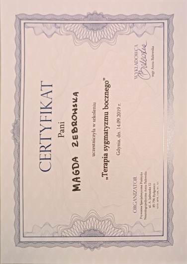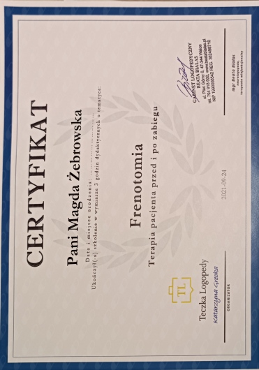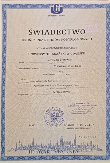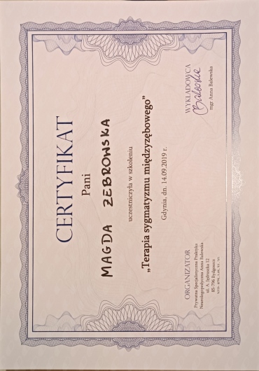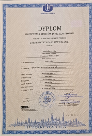 Jako logopeda oraz terapeuta miofunkcjonalny pracuję od 5 lat – w przedszkolu, poradniach psychologicznych oraz prywatnym gabinecie. Prowadzę terapię z dziećmi, które ukończyły 5. rok życia, z młodzieżą, z dorosłymi. Moim Pacjentom pomagam poradzić sobie z wadami wymowy, afazją, zaburzeniami miofunkcjonalnymi, jąkaniem, emisja głosu i innymi. Prowadzę również konsultacje oraz diagnozy logopedyczne. Zajęcia prowadzę w przyjaznej atmosferze dla dziecka, pracujemy przez zabawę. Wierzę, że nie ma dwóch identycznych przypadków, dlatego do każdego Pacjenta podchodzę indywidualnie i dostosowuję do niego sposób działania. Jestem absolwentką Uniwersytetu Gdańskiego. Ukończyłam studia magisterskie na kierunku „Logopedia” oraz Podyplomowe Studia Neurologopedyczne. Serdecznie Państwa zapraszam do skorzystania z moich usług.