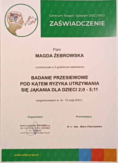 Jaki jest zakres porad oferowanych przez Magda Żebrowska?Magda Żebrowska to logopeda. Na podstawie swojego doświadczenia i wykształcenia Magda Żebrowska oferuje usługi takie jak: ćwiczenia emisji głosu i dykcji, korekcja wad wymowy, konsultacja neurologopedyczna, diagnoza neurologopedyczna, terapia neurologopedyczna dzieci, terapia neurologopedyczna, opinia neurologopedyczna, diagnoza logopedyczna, terapia miofunkcjonalna, diagnoza miofunkcjonalna.
