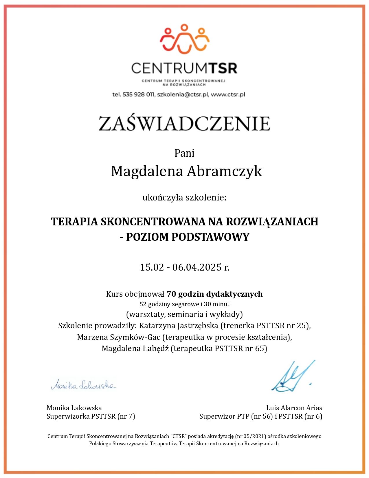 Jestem absolwentką Akademii Pedagogiki Specjalnej na Wydziale Psychologii, specjalność Psychologia Kliniczna. Obecnie jestem studentką III roku 4-letniej Szkoły Psychoterapii Integratywnej w Warszawie akredytowanej przez Polskie Towarzystwo Psychoterapii Integratywnej. Ponadto ukończyłam Kurs Racjonalnej Terapii Zachowania (RTZ) oraz Terapii Skoncentrowanej na Rozwiązaniach (I stopień).