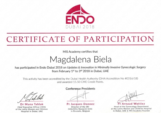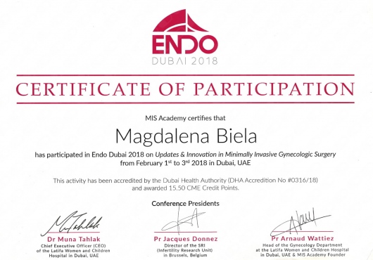 Wykonuje badanie USG endometriozy głęboko naciekającej. Ukończyła staż z zakresu diagnostyki i leczenia endometriozy w referencyjnym ośrodku leczenia endometriozy w Weronie we Włoszech - Department of Obstetrics and Gynecology, Gynecology Oncology and Minimally Invasive Pelvic Surgery.