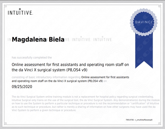 Obroniła rozprawę doktorską dotyczącą zabiegów histeroskopowych.