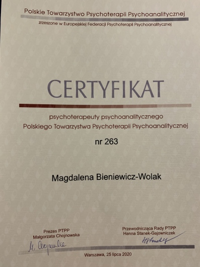 Jestem psychologiem i psychoterapeutką psychoanalityczną, posiadam certyfikat Polskiego Towarzystwa Psychoterapii Psychoanalitycznej. Pracuję z osobami dorosłymi, indywidualnie, w procesach długoterminowych, w ujęciu psychoanalitycznym i psychodynamicznym.