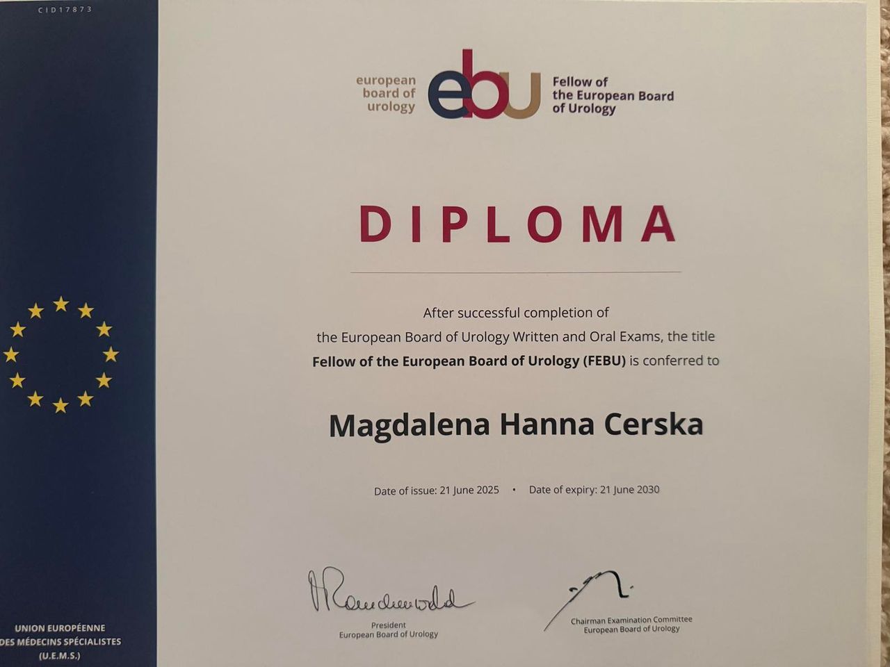 Jestem specjalistą urologii, FEBU. Ukończyłam Wydział Lekarski Uniwersytetu Medycznego w Łodzi. Jestem Członkiem Polskiego Towarzystwa Urologicznego (PTU) oraz Europejskiego Towarzystwa Urologicznego (EAU). Posiadam certyfikaty Polskiego Towarzystwa Ultrasonograficznego z zakresu USG układu moczowego, gruczołu krokowego i moszny. Zajmuję się diagnostyką, leczeniem zabiegowym oraz profilaktyką schorzeń układu moczowo-płciowego u mężczyzn oraz układu moczowego u kobiet. W kręgu moich zawodowych zainteresowań znajduje się leczenie chorób nowotworowych układu moczowego, przewlekłych infekcji dróg moczowych oraz zespołu pęcherza nadaktywnego.