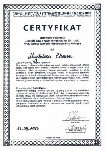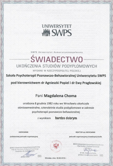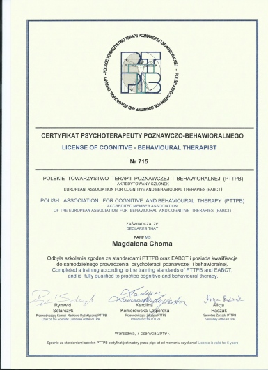 Jaki jest zakres porad oferowanych przez Magdalena Choma?Magdalena Choma to psycholog, psychoterapeuta certyfikowany. Na podstawie swojego doświadczenia i wykształcenia Magdalena Choma oferuje usługi takie jak: psychoterapia indywidualna, poradnictwo psychologiczne, interwencja kryzysowa, terapia behawioralna, ustawienia systemowe indywidualne, konsultacja psychoterapeutyczna dla par, Konsultacja psychologiczna.