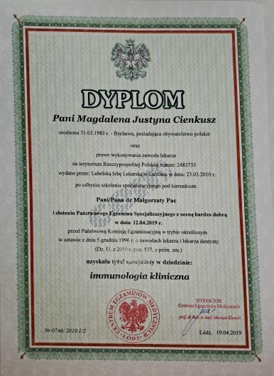 W 2019r. uzyskała tytuł specjalisty immunologii klinicznej.