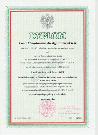 W 2016r. uzyskała tytuł specjalisty pediatrii.