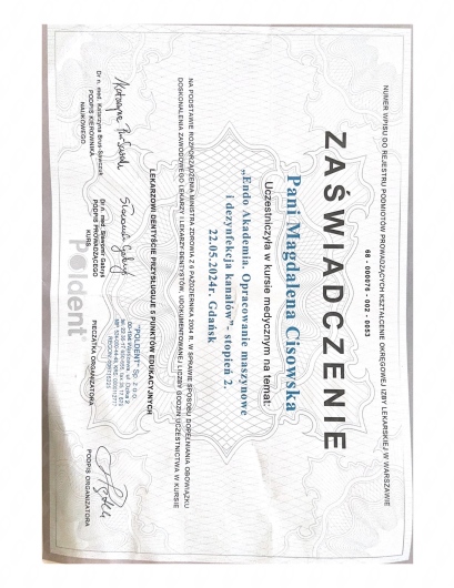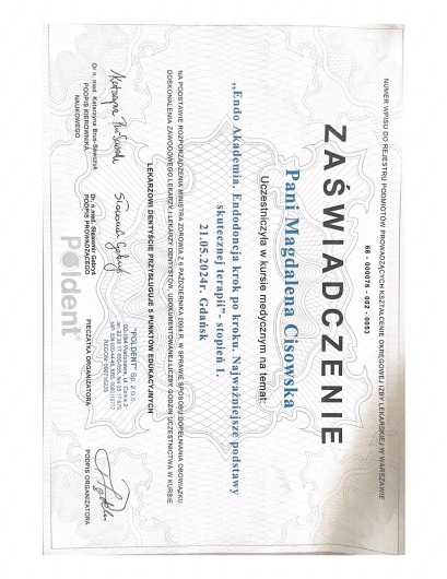 Jaki jest zakres porad oferowanych przez Magdalena Cisowska?Magdalena Cisowska to stomatolog. Na podstawie swojego doświadczenia i wykształcenia Magdalena Cisowska oferuje usługi takie jak: Badanie stomatologiczne, leczenie kanałowe pod mikroskopem, fluoryzacja zębów, scaling + piaskowanie, usuwanie kamienia nazębnego, lakowanie zębów, nakładkowe wybielanie zębów, Tomografia żuchwy, Tomografia szczęki i żuchwy, zdjęcia pantomograficzne.