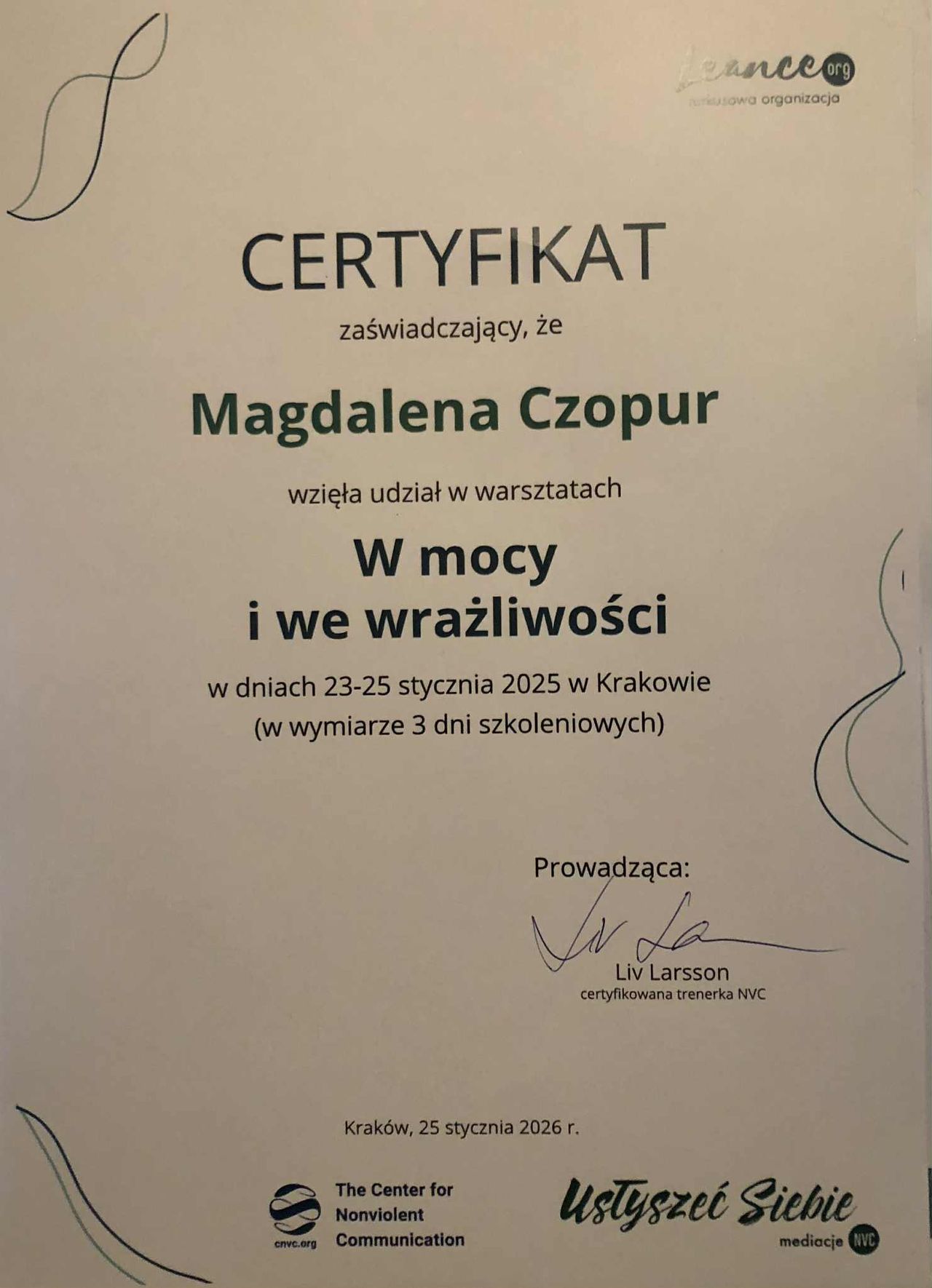 Specjalizuję się w pracy z konfliktem, zarówno w relacjach rodzinnych, jak i partnerskich. Łączę podejście psychologiczne z mediacją oraz komunikacją opartą na empatii (NVC). Pomagam zatrzymać eskalację napięcia i stworzyć bezpieczną przestrzeń do spokojnej, konstruktywnej rozmowy.