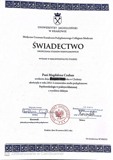 Studiowałam psychoonkologię na Uniwersytecie Jagiellońskim na Wydziale Lekarskim.
