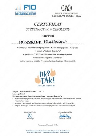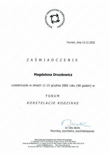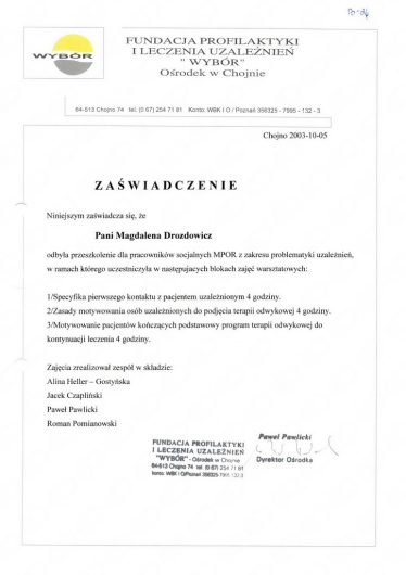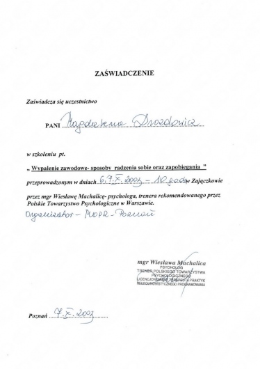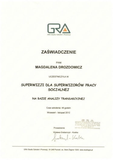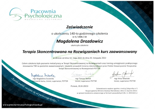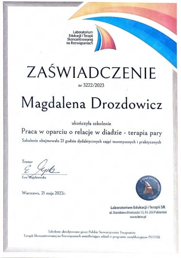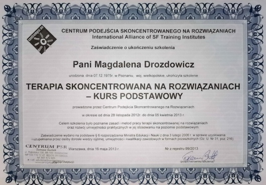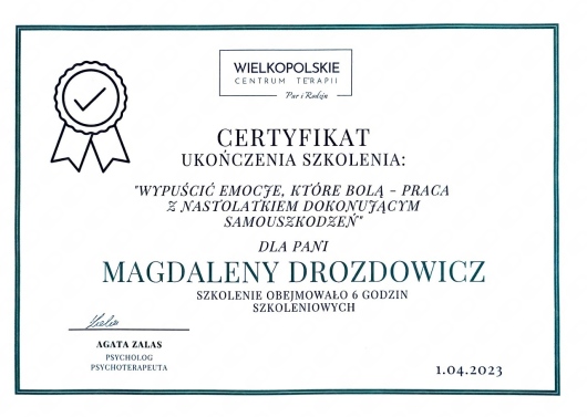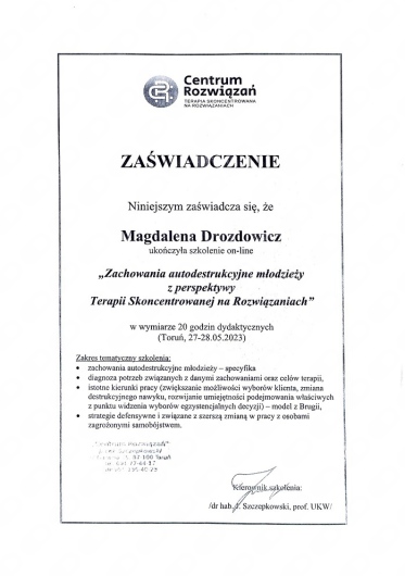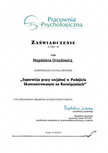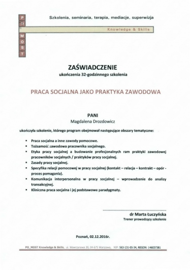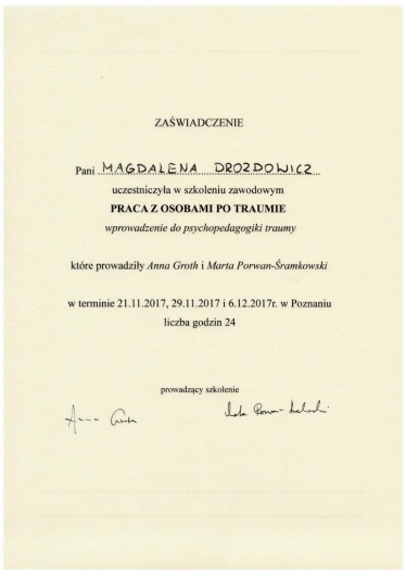 Regularnie uczestniczę w szkoleniach i superwizjach, aby zapewniać najwyższy standard pomocy.