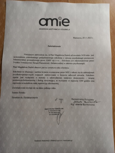 Miałam przyjemność uczestniczyć w terapii poznawczo-behawioralnej u Pani Magdaleny Dudek przez 8 miesięcy i z całym przekonaniem mogę powiedzieć, że była to jedna z najlepszych decyzji, jakie podjęłam. Pani Magdalena to niezwykle ciepła, empatyczna i profesjonalna terapeutka, która potrafi stworzyć atmosferę pełną zaufania i zrozumienia. Czuję ogromną wdzięczność za ten wspólny czas i z pełnym spokojem polecam ją każdemu, kto szuka rzetelnej pomocy psychologicznej.