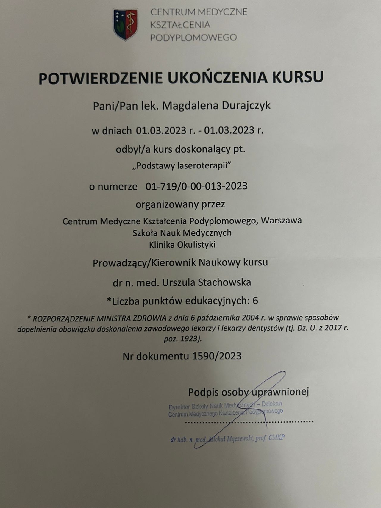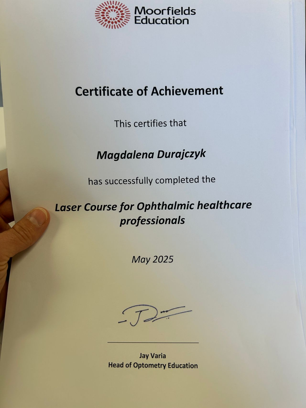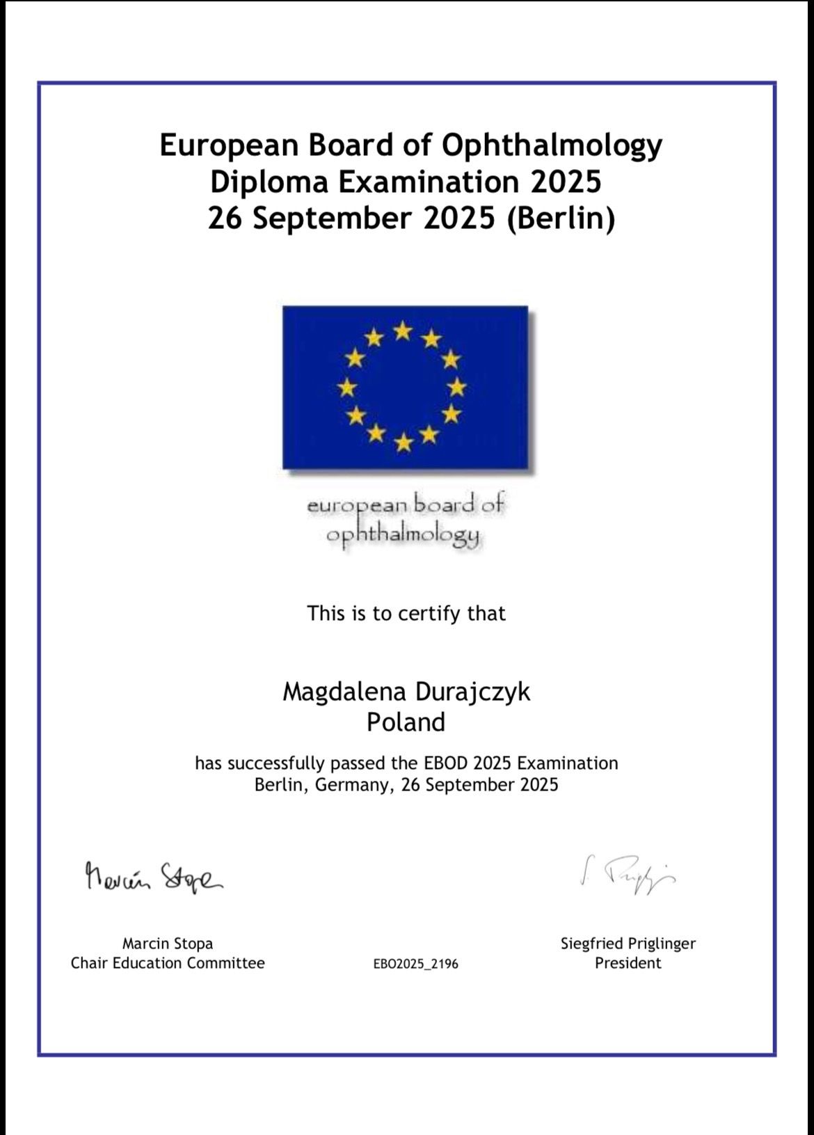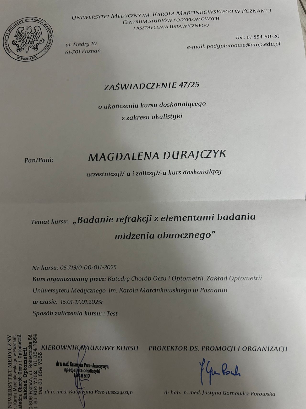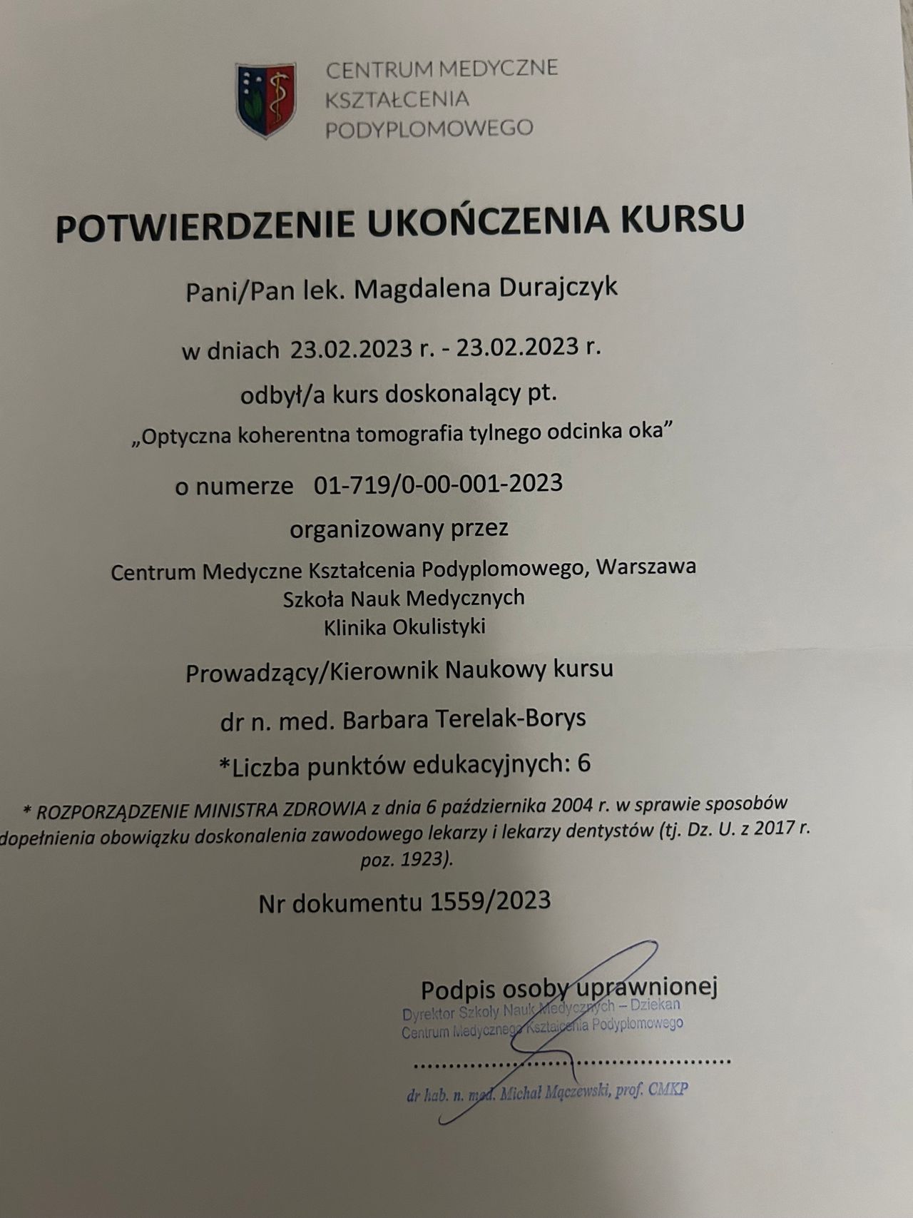 Jaki jest zakres porad oferowanych przez Magdalena Durajczyk?Magdalena Durajczyk to w trakcie specjalizacji (okulista). Na podstawie swojego doświadczenia i wykształcenia Magdalena Durajczyk oferuje usługi takie jak: konsultacja okulistyczna dorośli, konsultacja okulistyczna + badanie OCT, Biometria, pomiar ciśnienia wewnątrzgałkowego, OCT plamek, OCT tarczy, OCT zdjęcie dna oka, GCC, badanie Angio-OCT, AS-OCT - badanie tomograficzne przedniej komory.