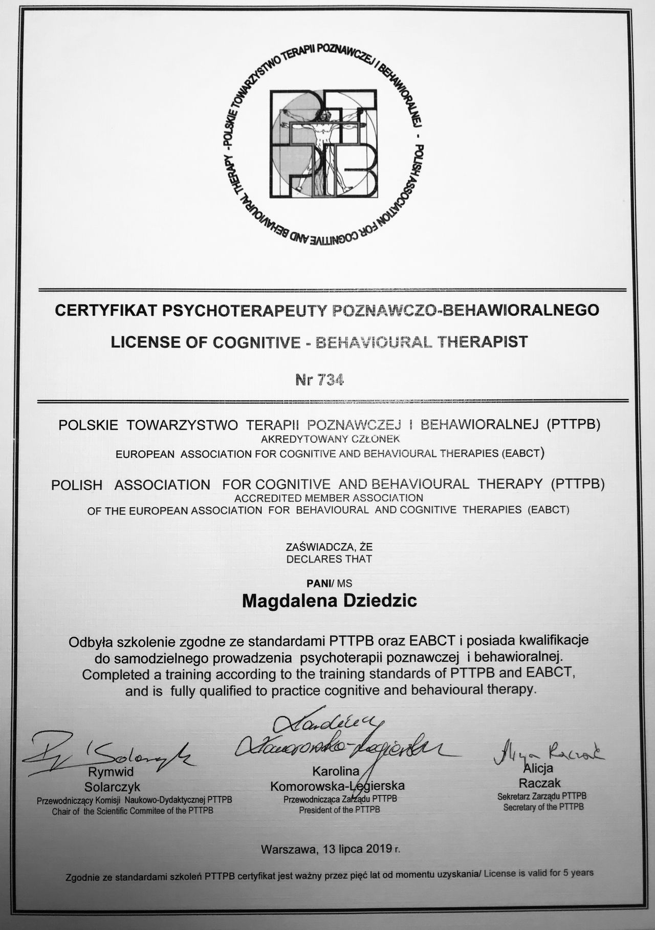 Jestem psychologiem, absolwentką Uniwersytetu Śląskiego w Katowicach oraz Uniwersytetu SWPS w Warszawie ze specjalizacją kliniczną, certyfikowanym psychoterapeutą poznawczo-behawioralnym po ukończonym 4-letnim kursie psychoterapii w Szkole Psychoterapii dr A. Popiel i dr E. Pragłowskiej, a także seksuologiem. Posiadam Certyfikat Psychoterapeuty Poznawczo-Behawioralnego Polskiego Towarzystwa Terapii Poznawczo Behawioralnej nr 734. W codziennej praktyce zajmuje się przede wszystkim diagnozą i psychoterapią indywidualną osób dorosłych oraz młodzieży. Pracuję pod stałą i regularną superwizją certyfikowanych superwizorów CBT. Do każdego pacjenta podchodzę w sposób indywidualny i profesjonalny wykorzystując swoją wiedzę i doświadczenie. Praca z drugim człowiekiem od zawsze była i jest moją pasją, dlatego wykonuję ją z pełnym zaangażowaniem i radością dając swoim pacjentom poczucie, że znajdują się we właściwym miejscu. Pracuję w nurcie poznawczo-behwioralnym (CBT), który jest nurtem o największej liczbie potwierdzonych badań naukowych nad skutecznością oddziaływań psychoterapeutycznych w leczeniu większości zaburzeń psychicznych. W swojej pracy wykorzystuję klasyczne metody terapii CBT oraz elementy tzw. trzeciej fali. Szczególnie bliskie są mi techniki wykorzystywane w mindfulness oraz terapii ACT.