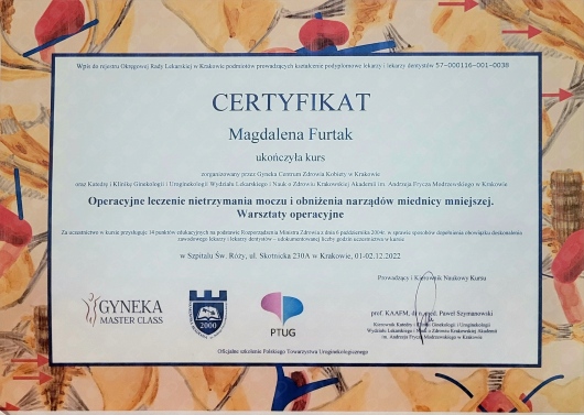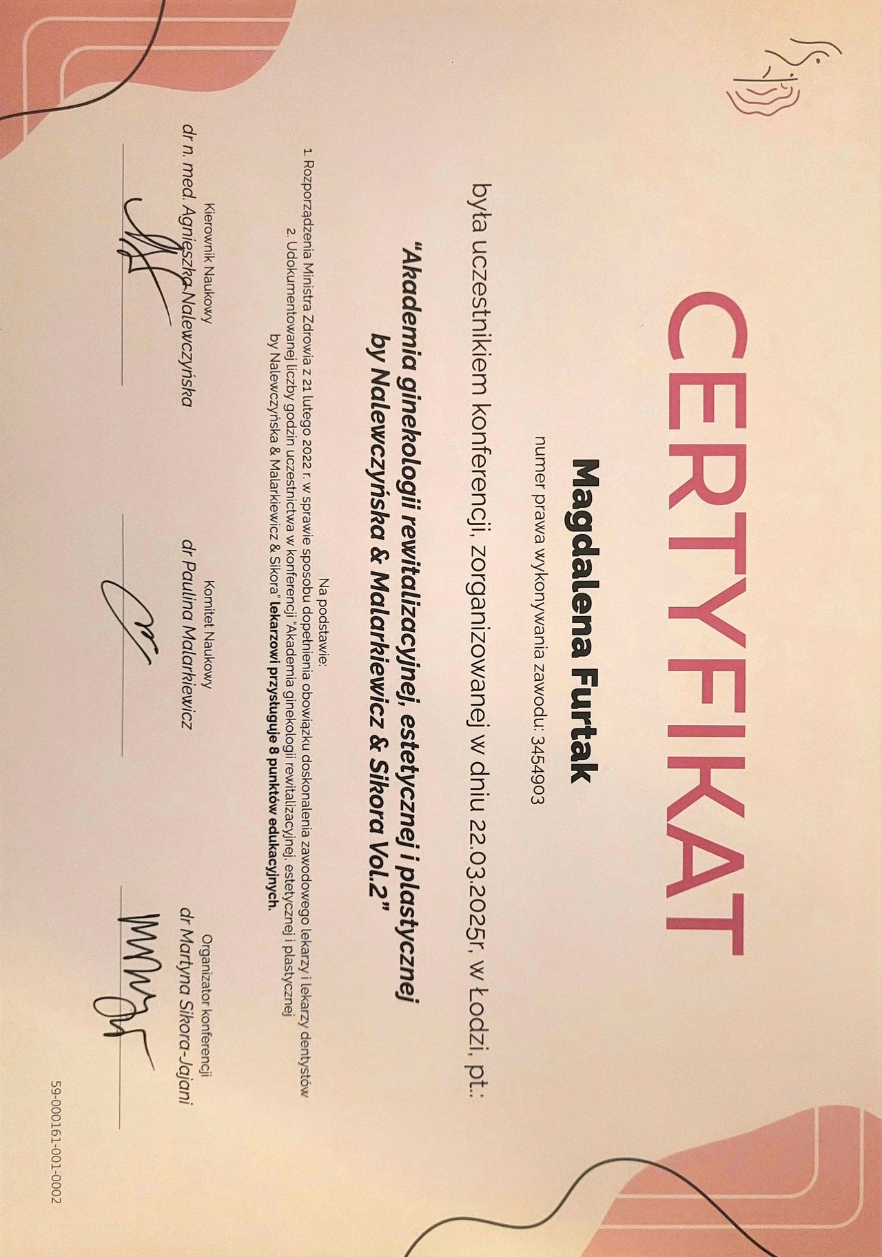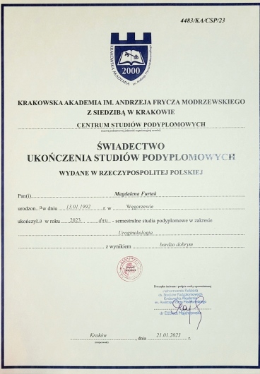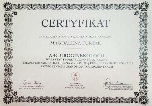 Jaki jest zakres porad oferowanych przez Magdalena Furtak?Magdalena Furtak to w trakcie specjalizacji (ginekolog). Na podstawie swojego doświadczenia i wykształcenia Magdalena Furtak oferuje usługi takie jak: konsultacja ginekologiczna, konsultacja uroginekologiczna + USG uroginekologiczne, konsultacja ginekologiczna + USG, Założenie wkładki domacicznej Mirena/Jaydess/Kyleena, usunięcie wkładki domacicznej, cytologia cienkowarstwowa LBC, Wizyta uroginekologiczna z doborem pessara, USG położnicze, obniżenie narządu rodnego - konsultacja, Badania infekcji urogenitalnych.