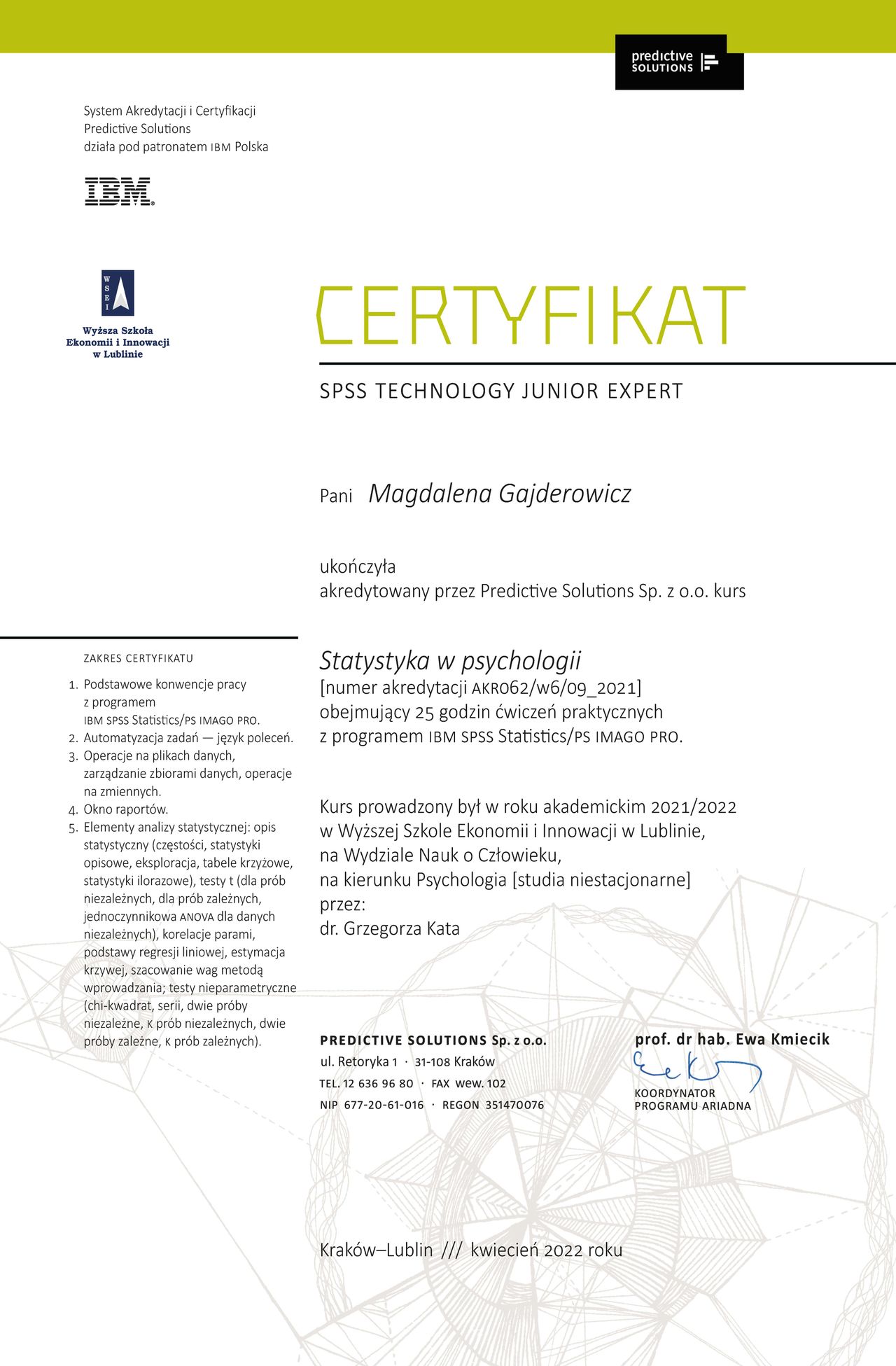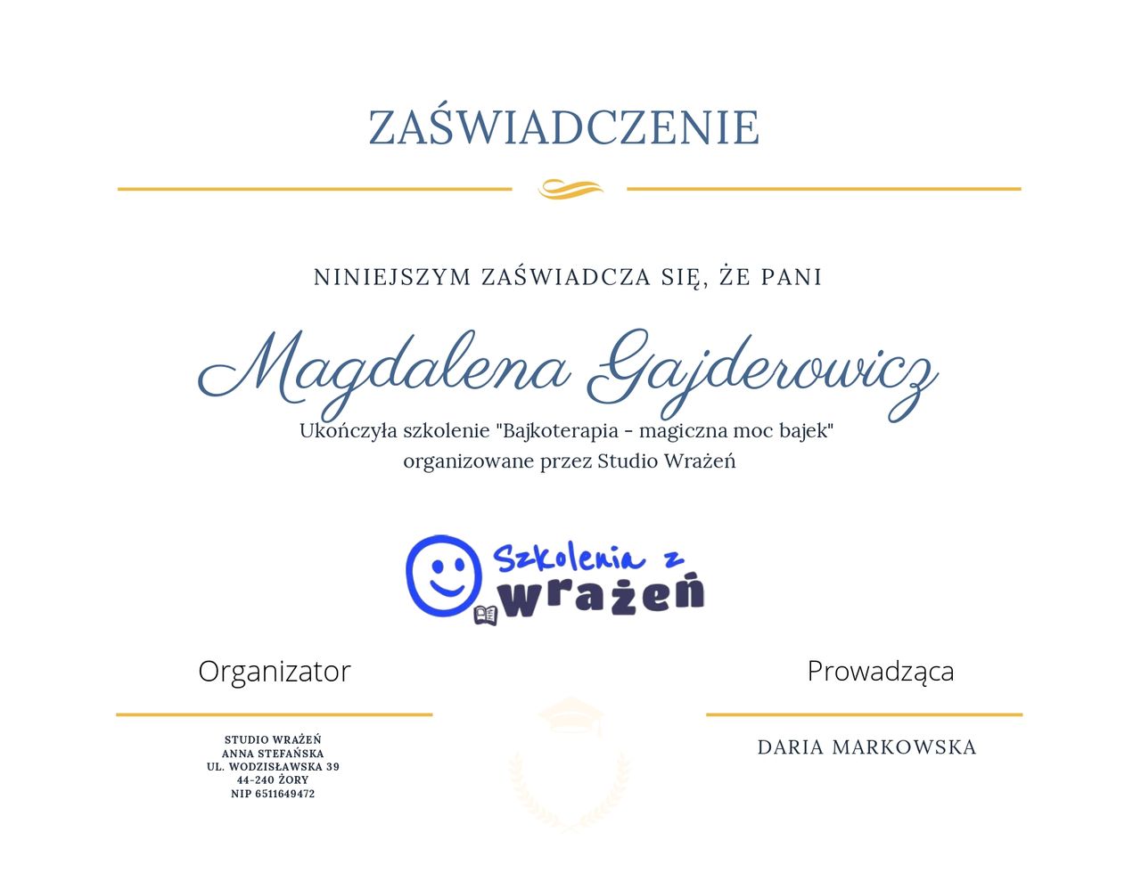 Ukończyłam studia magisterskie z zakresu psychologii oraz studia magisterskie i doktranckie z zakresu pedagogiki. Jestem również absolwentką filologii polskiej. Ponadto ukończyłam 4,5-letni kurs psychoterapii pod kierownictwem dr. hab. Andrzeja Cechnickiego, prowadzonego w orientacji psychodynamicznej i systemowej. Obecnie jestem w trakcie szkolenia uprawniającego do ubiegania się o certyfikat Asystenta Psychodramy. Jestem również członkiem Polskiego Towarzystwa Psychiatrycznego.