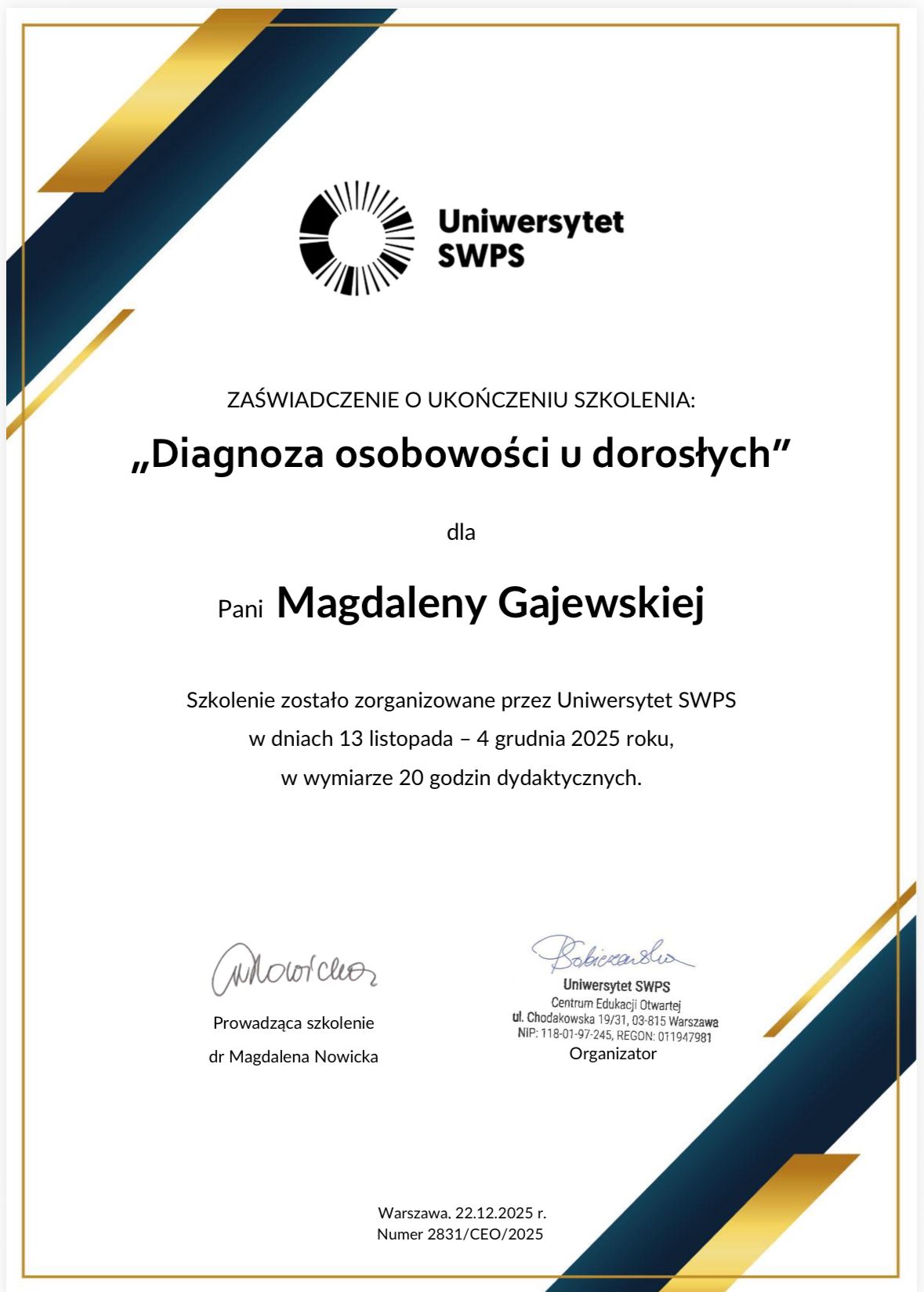 Jestem po wizycie u Pani Magdaleny. Muszę przyznać, że czułem się bardzo bezpiecznie. Terapeutka ze zrozumieniem słuchała o moich problemach, nie czułem się oceniany. Bardzo polecam konsultacje u tej specjalistki.