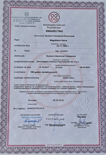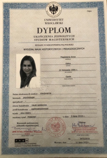 Jestem psychologiem, interwentem kryzysowy, psychotraumatologiem oraz psychologiem w trakcie szkolenia psychoterapeutycznego. Obecnie jestem w trakcie całościowego szkolenia w warszawskim Labolatorium Psychoedukacji w nurcie psychodynamicznym z nastawieniem na relacje. Stawiam więc na indywidualną relację podczas prowadzenia konsultacji/ terapii oraz na autentyczność wsparcia.