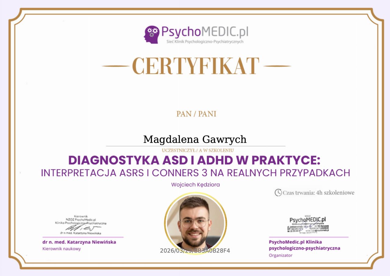 Jaki jest zakres porad oferowanych przez Magdalena Gawrych?Magdalena Gawrych to psycholog. Na podstawie swojego doświadczenia i wykształcenia Magdalena Gawrych oferuje usługi takie jak: Konsultacja psychologiczna, Diagnoza ADHD, Diagnoza autyzmu, diagnoza zaburzeń osobowości, Pakiet 5 wizyt.