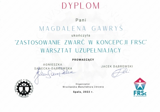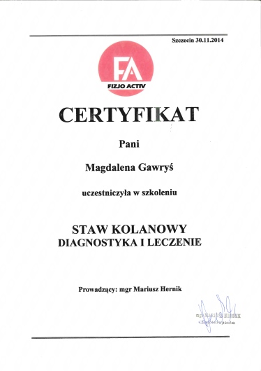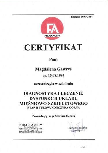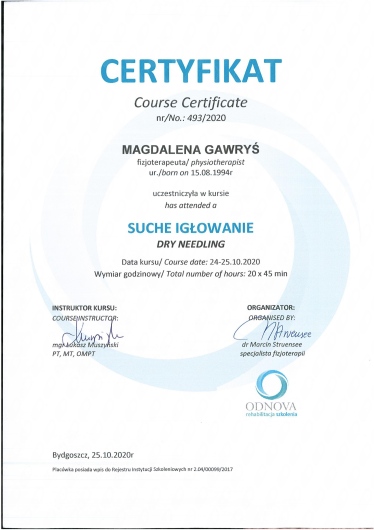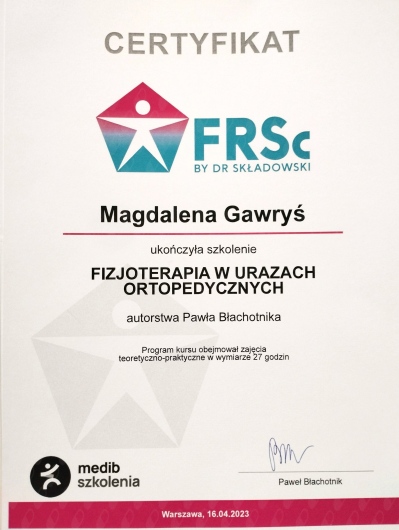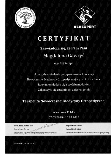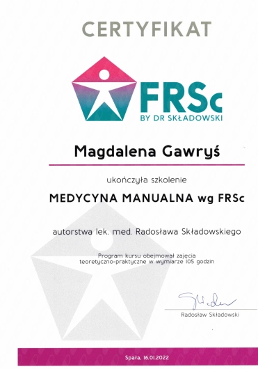 Specjalizuję się w rehabilitacji ortopedycznej, a narzędzia do pracy z pacjentami ze schorzeniami układu ruchu zdobyłam dzięki szeregom kursów, w tym m.in. szkoleniu podyplomowemu w koncepcji dr. J. Cyriaxa oraz Terapii Manualnej autorstwa lek. Radosława Składowskiego. Dały mi one możliwość pracy za pomocą technik: terapii manualnej, pinoterapii, igłoterapii, terapii wisceralnej, elementów osteopatii, masażu tkanek głębokich, terapii psychosomatycznej.