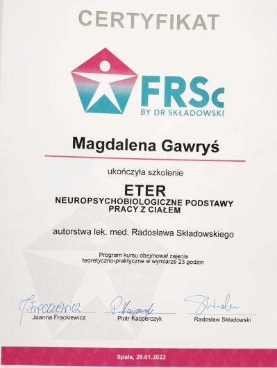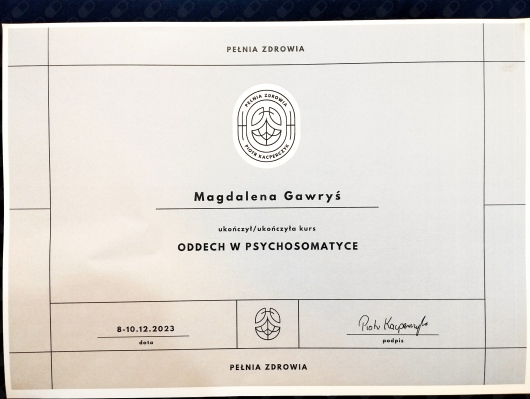 Zajmuję się również pracą z pacjentami przewlekle zestresowanymi stosując techniki oddechowe, mindfulness, wizualizuje. Prowadzę także sesje oddechowe w celu pracy z napięciami psychosomatycznymi.
