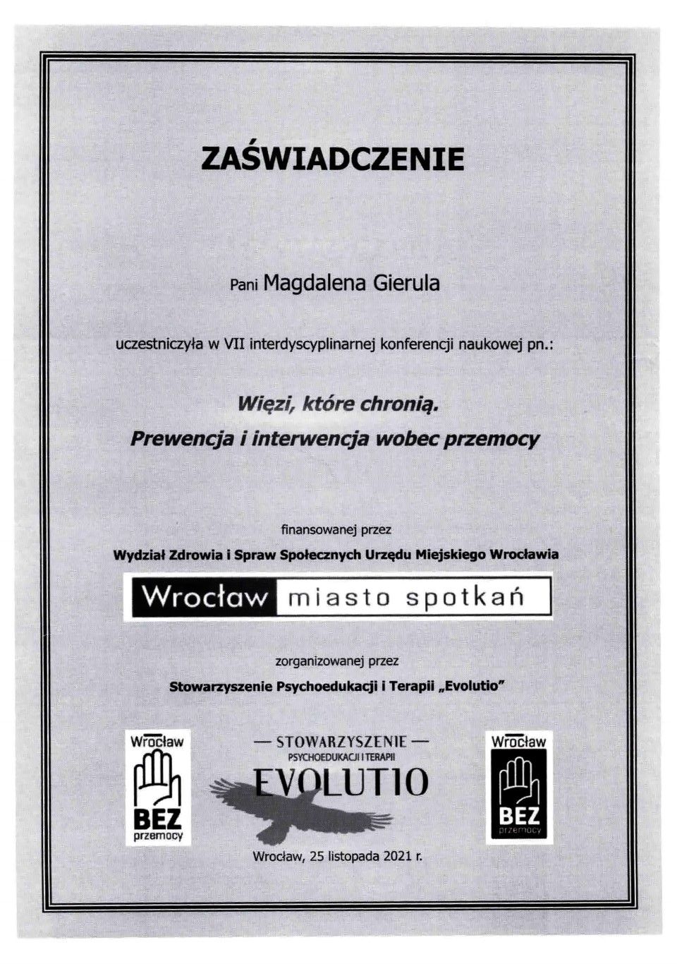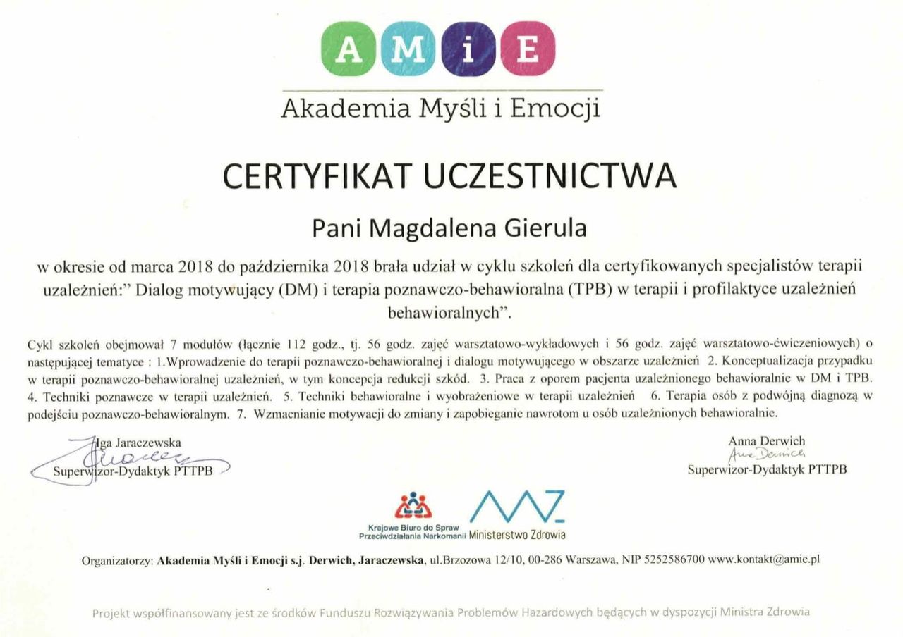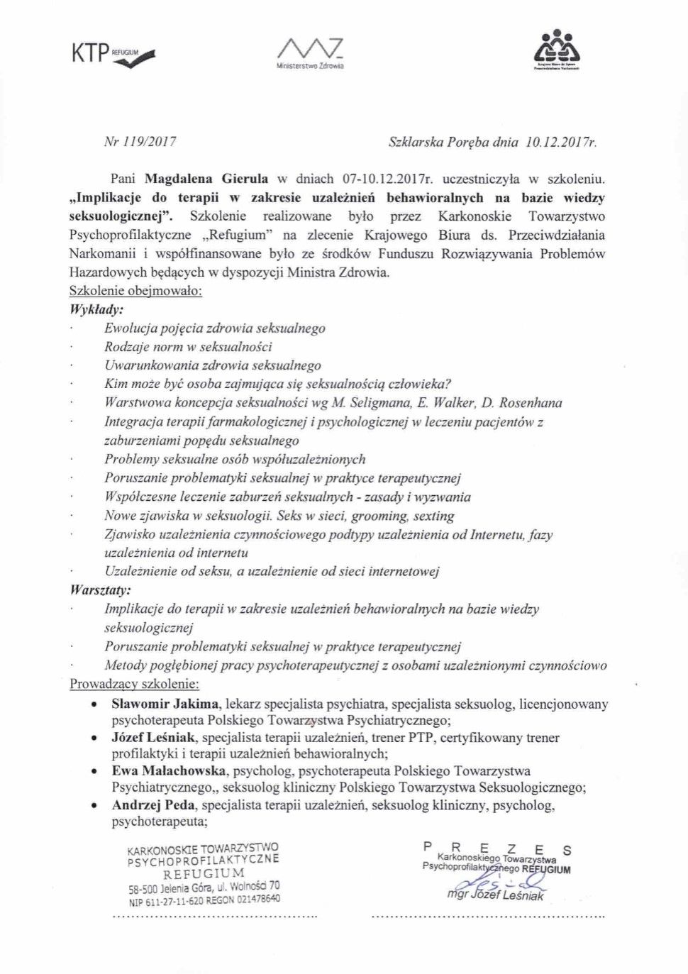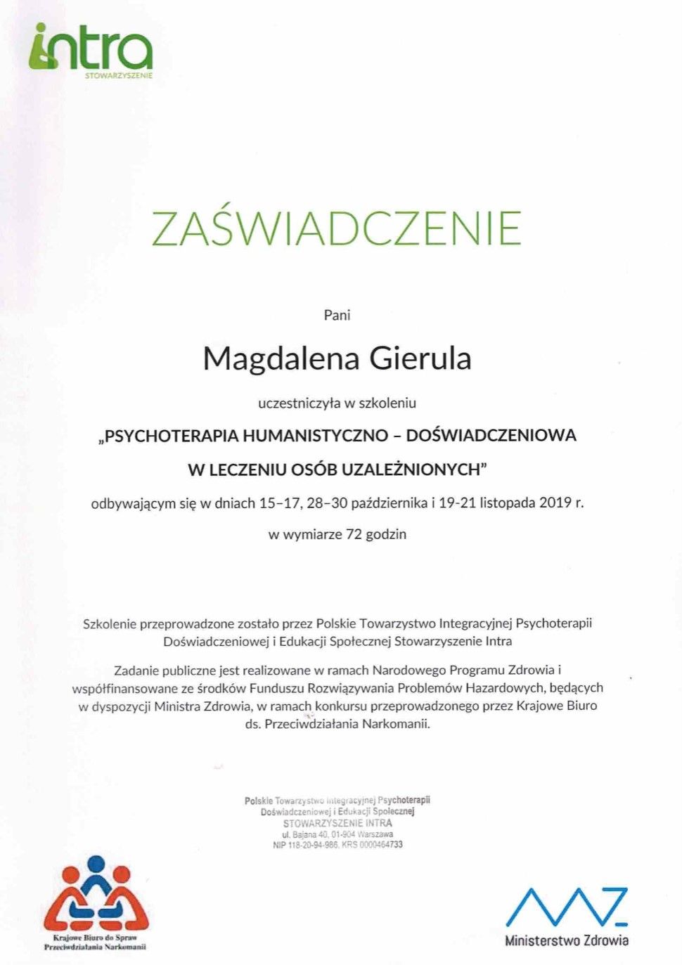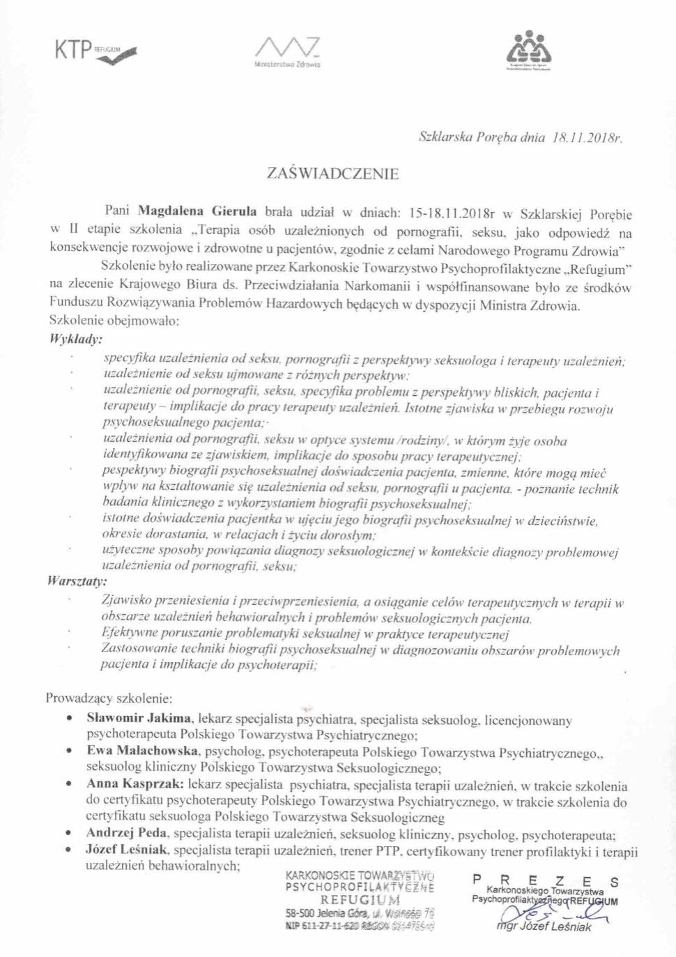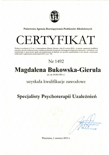 WYKSZTAŁCENIE: Certyfikat Specjalisty Psychoterapii Uzależnień nr 1492, PARPA, Szkoła Psychoterapii Humanistycznej w Ośrodku Pomocy i Edukacji Psychologicznej INTRA- w trakcie szkolenia. Udział w konferencji „Więzi, które chronią .Pomoc w obliczu zmian” Stowarzyszenie Psychoedukacji i Terapii „Evolutio”, Gabinet Psychologiczno-Seksuologiczny Damian Haak- szkolenie specjalistyczne przygotowujące do pracy z osobami LGBTQ+, Fundację Promocji Zdrowia Psychicznego i Somatycznego Vis Salutis- szkolenie z psychoterapii osób doświadczającymi syndromu DDA cz.1 i cz.2, Polskie Towarzystwo Integracyjnej Psychoterapii Doświadczeniowej i Edukacji Społecznej Stowarzyszenie Intra. Psychoterapia Humanistyczno-Doświadczeniowa w leczeniu osób uzależnionych, CARE BROK sp. z o.o. w Broku Szkoła Specjalistów Psychoterapii Uzależnień i Instruktorów Terapii Uzależnień Program Ograniczenia Picia zgodnie z „Zaleceniami do tworzenia i realizowania programów ograniczenia picia w placówkach leczenia uzależnień” opracowanymi przez PARPA, Karkonoskie Towarzystwo Psychoprofilaktyczne „ Refegium”- szkolenie z terapii osób uzależnionych od pornografii, seksu, jako odpowiedź na konsekwencje rozwojowe i zdrowotne u pacjentów, zgodnie z celami Narodowego Funduszu Zdrowia- I i II etap, Instytut Dialogu Motywującego - Konferencja we Wrocławiu pt. Zastosowanie Dialogu Motywującego w pracy z osobami doświadczającymi i stosującymi przemoc, w tym seksualną, Akademia Myśli i Emocji w Warszawie - Dialog motywujący i terapia poznawczo-behawioralna w terapii i profilaktyce uzależnień behawioralnych, Szkoła Psychoterapii w Polskim Instytucie Ericksonowskim- ukończony 5 miesięczny kurs atestowanego przez SNPPTP, Szkoła Terapii Skoncentrowanej na Rozwiązaniach – szkolenie na poziomie I stopnia, akredytowany ośrodek PSTTSR, Udział w Międzynarodowej konferencji pracy z ciałem „SAPERE”, Stowarzyszenie Nowej Psychologii, Szkolenie w terapii osób z uzależnieniami behawioralnymi, Instytut Psychologii Zdrowia Polskiego Towarzystwa Psychologicznego, Krajowe Biuro Do Spraw Przeciwdziałania Narkomanii, Studium Terapii Uzależnień i Współuzależnienia, Instytut Psychologii Zdrowia Polskiego Towarzystwa Psychologicznego, Pedagog, Dolnośląska Szkoła Wyższa, Kierunek Resocjalizacja, Wydziale Nauk Pedagogicznych.