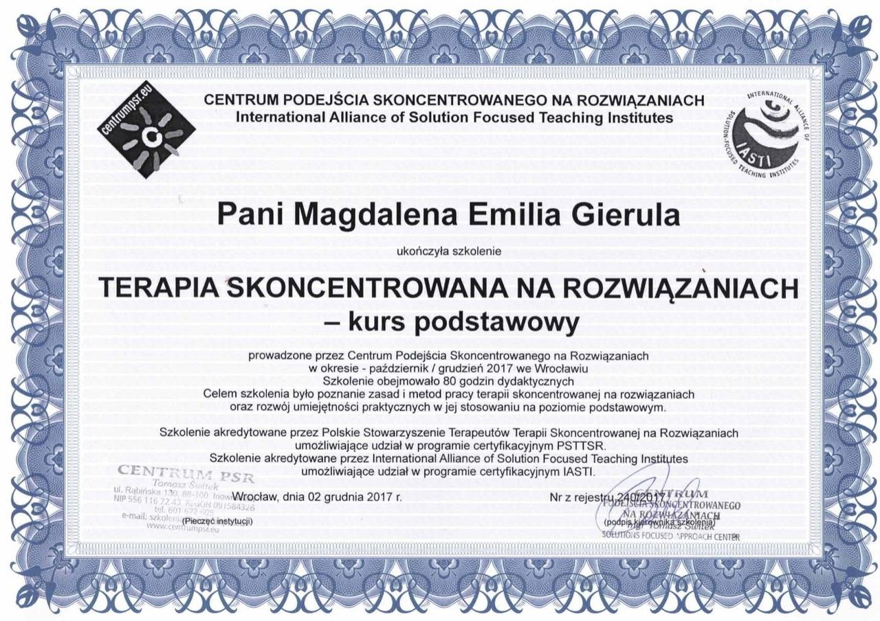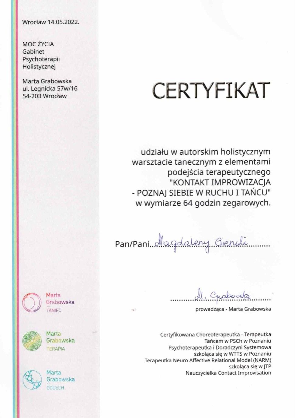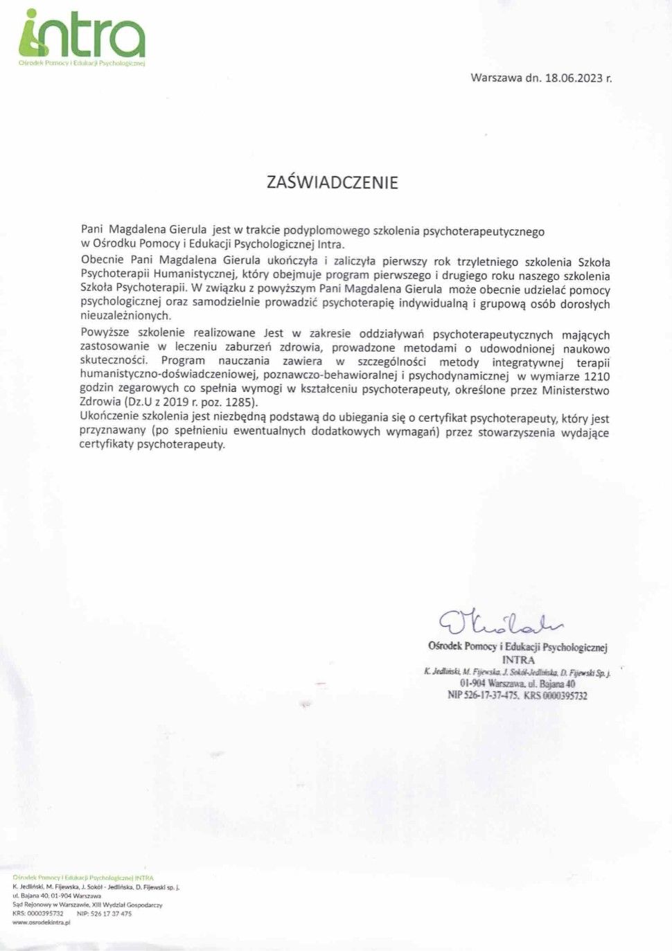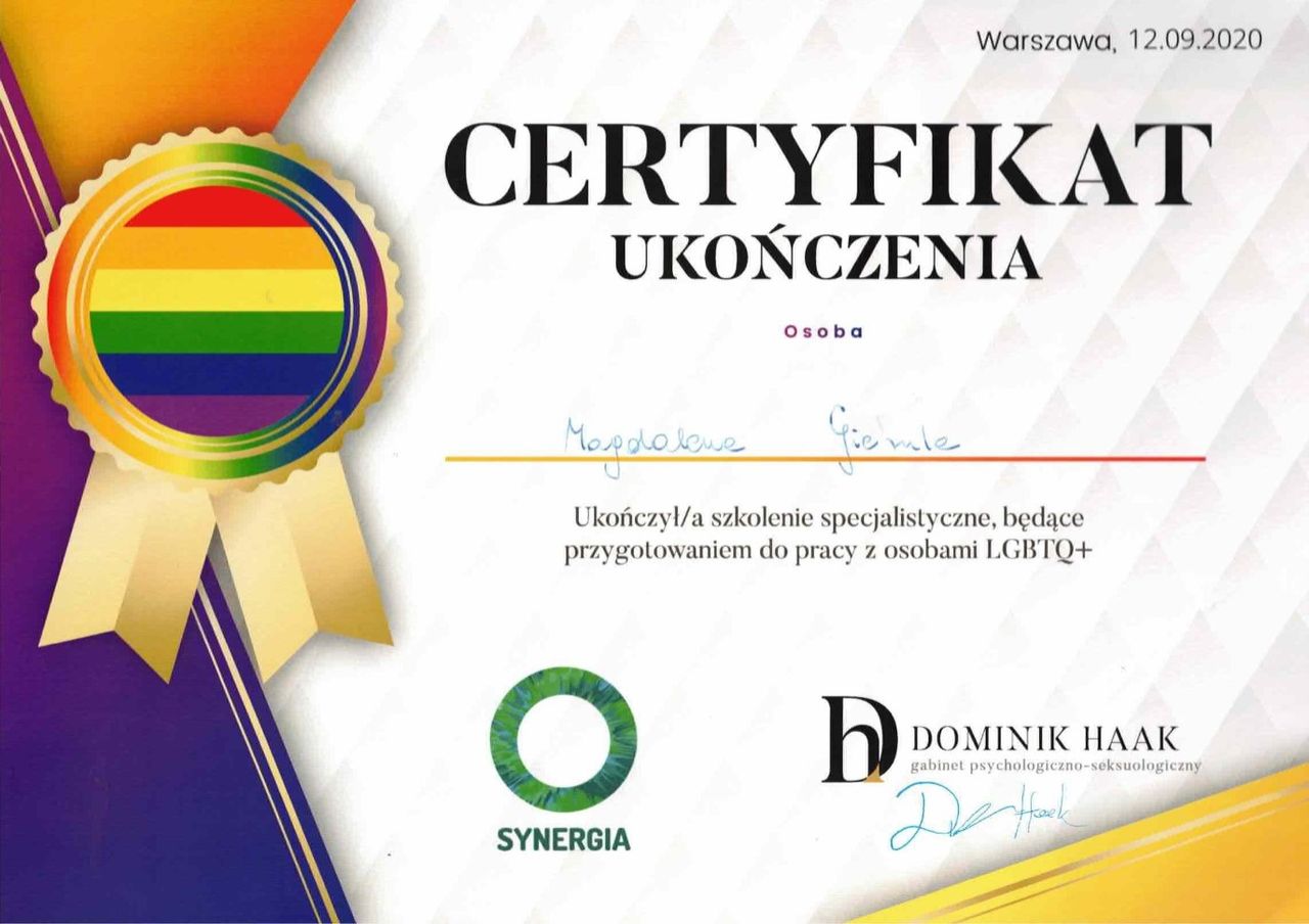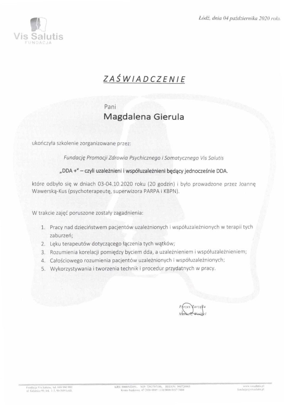 WYKSZTAŁCENIE: Certyfikat Specjalisty Psychoterapii Uzależnień nr 1492, PARPA, Szkoła Psychoterapii Humanistycznej w Ośrodku Pomocy i Edukacji Psychologicznej INTRA- w trakcie szkolenia. Udział w konferencji „Więzi, które chronią .Pomoc w obliczu zmian” Stowarzyszenie Psychoedukacji i Terapii „Evolutio”, Gabinet Psychologiczno-Seksuologiczny Damian Haak- szkolenie specjalistyczne przygotowujące do pracy z osobami LGBTQ+, Fundację Promocji Zdrowia Psychicznego i Somatycznego Vis Salutis- szkolenie z psychoterapii osób doświadczającymi syndromu DDA cz.1 i cz.2, Polskie Towarzystwo Integracyjnej Psychoterapii Doświadczeniowej i Edukacji Społecznej Stowarzyszenie Intra. Psychoterapia Humanistyczno-Doświadczeniowa w leczeniu osób uzależnionych, CARE BROK sp. z o.o. w Broku Szkoła Specjalistów Psychoterapii Uzależnień i Instruktorów Terapii Uzależnień Program Ograniczenia Picia zgodnie z „Zaleceniami do tworzenia i realizowania programów ograniczenia picia w placówkach leczenia uzależnień” opracowanymi przez PARPA, Karkonoskie Towarzystwo Psychoprofilaktyczne „ Refegium”- szkolenie z terapii osób uzależnionych od pornografii, seksu, jako odpowiedź na konsekwencje rozwojowe i zdrowotne u pacjentów, zgodnie z celami Narodowego Funduszu Zdrowia- I i II etap, Instytut Dialogu Motywującego - Konferencja we Wrocławiu pt. Zastosowanie Dialogu Motywującego w pracy z osobami doświadczającymi i stosującymi przemoc, w tym seksualną, Akademia Myśli i Emocji w Warszawie - Dialog motywujący i terapia poznawczo-behawioralna w terapii i profilaktyce uzależnień behawioralnych, Szkoła Psychoterapii w Polskim Instytucie Ericksonowskim- ukończony 5 miesięczny kurs atestowanego przez SNPPTP, Szkoła Terapii Skoncentrowanej na Rozwiązaniach – szkolenie na poziomie I stopnia, akredytowany ośrodek PSTTSR, Udział w Międzynarodowej konferencji pracy z ciałem „SAPERE”, Stowarzyszenie Nowej Psychologii, Szkolenie w terapii osób z uzależnieniami behawioralnymi, Instytut Psychologii Zdrowia Polskiego Towarzystwa Psychologicznego, Krajowe Biuro Do Spraw Przeciwdziałania Narkomanii, Studium Terapii Uzależnień i Współuzależnienia, Instytut Psychologii Zdrowia Polskiego Towarzystwa Psychologicznego, Pedagog, Dolnośląska Szkoła Wyższa, Kierunek Resocjalizacja, Wydziale Nauk Pedagogicznych.