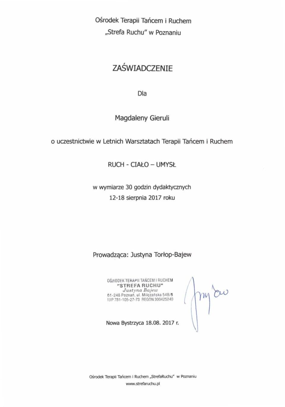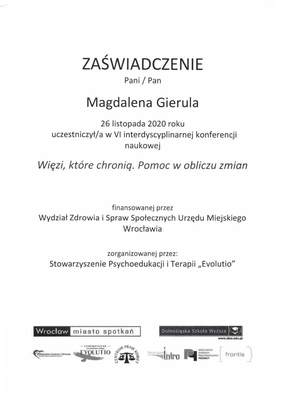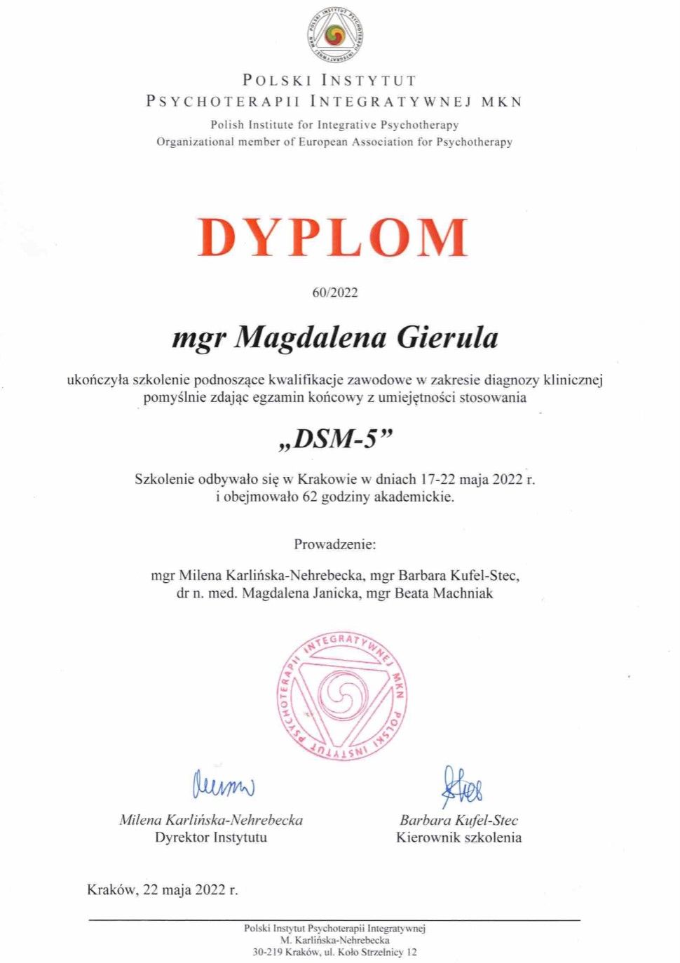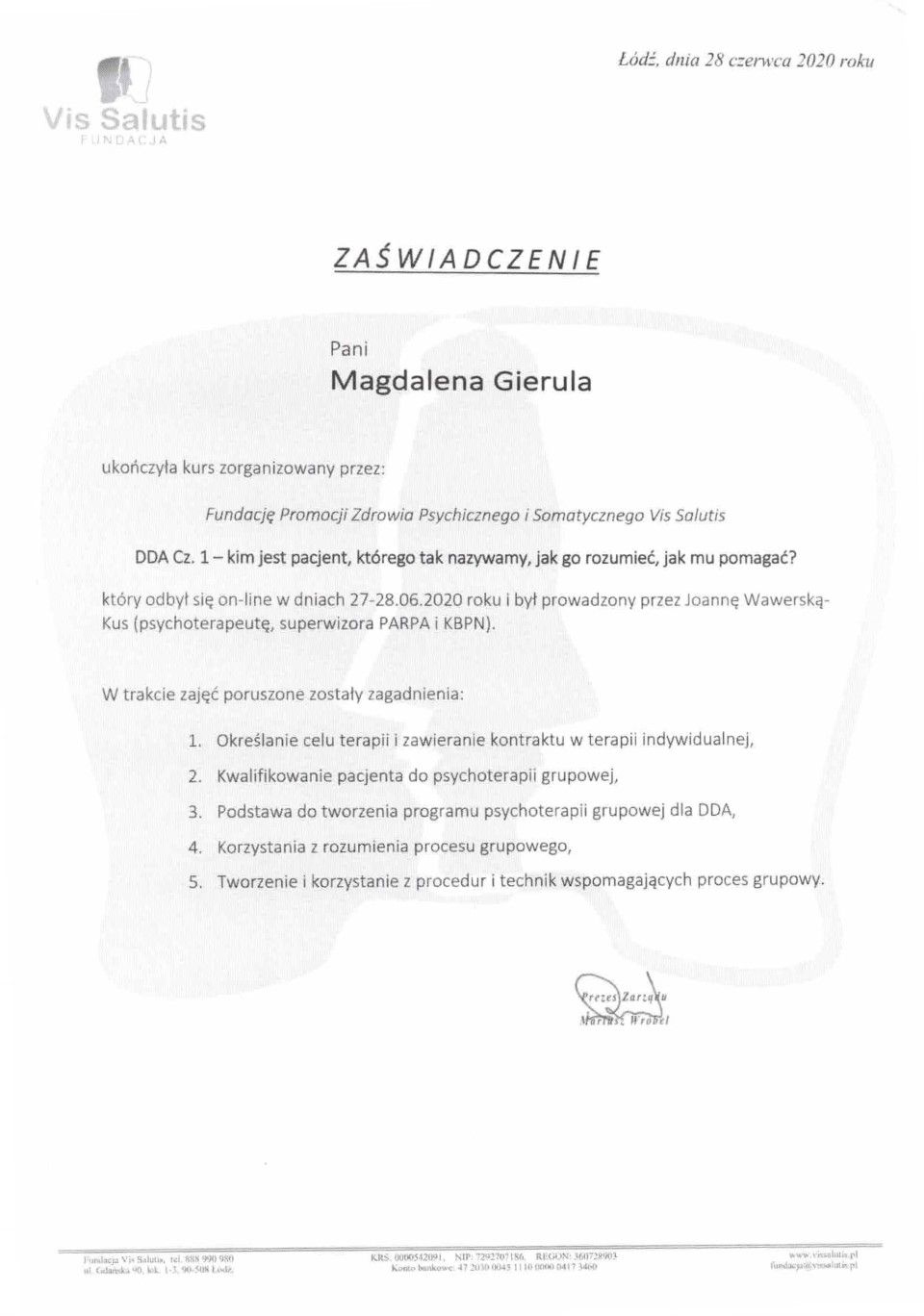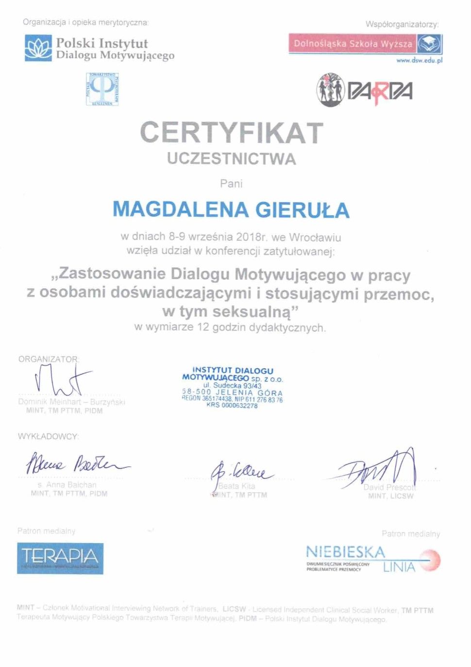 WYKSZTAŁCENIE: Certyfikat Specjalisty Psychoterapii Uzależnień nr 1492, PARPA, Szkoła Psychoterapii Humanistycznej w Ośrodku Pomocy i Edukacji Psychologicznej INTRA- w trakcie szkolenia. Udział w konferencji „Więzi, które chronią .Pomoc w obliczu zmian” Stowarzyszenie Psychoedukacji i Terapii „Evolutio”, Gabinet Psychologiczno-Seksuologiczny Damian Haak- szkolenie specjalistyczne przygotowujące do pracy z osobami LGBTQ+, Fundację Promocji Zdrowia Psychicznego i Somatycznego Vis Salutis- szkolenie z psychoterapii osób doświadczającymi syndromu DDA cz.1 i cz.2, Polskie Towarzystwo Integracyjnej Psychoterapii Doświadczeniowej i Edukacji Społecznej Stowarzyszenie Intra. Psychoterapia Humanistyczno-Doświadczeniowa w leczeniu osób uzależnionych, CARE BROK sp. z o.o. w Broku Szkoła Specjalistów Psychoterapii Uzależnień i Instruktorów Terapii Uzależnień Program Ograniczenia Picia zgodnie z „Zaleceniami do tworzenia i realizowania programów ograniczenia picia w placówkach leczenia uzależnień” opracowanymi przez PARPA, Karkonoskie Towarzystwo Psychoprofilaktyczne „ Refegium”- szkolenie z terapii osób uzależnionych od pornografii, seksu, jako odpowiedź na konsekwencje rozwojowe i zdrowotne u pacjentów, zgodnie z celami Narodowego Funduszu Zdrowia- I i II etap, Instytut Dialogu Motywującego - Konferencja we Wrocławiu pt. Zastosowanie Dialogu Motywującego w pracy z osobami doświadczającymi i stosującymi przemoc, w tym seksualną, Akademia Myśli i Emocji w Warszawie - Dialog motywujący i terapia poznawczo-behawioralna w terapii i profilaktyce uzależnień behawioralnych, Szkoła Psychoterapii w Polskim Instytucie Ericksonowskim- ukończony 5 miesięczny kurs atestowanego przez SNPPTP, Szkoła Terapii Skoncentrowanej na Rozwiązaniach – szkolenie na poziomie I stopnia, akredytowany ośrodek PSTTSR, Udział w Międzynarodowej konferencji pracy z ciałem „SAPERE”, Stowarzyszenie Nowej Psychologii, Szkolenie w terapii osób z uzależnieniami behawioralnymi, Instytut Psychologii Zdrowia Polskiego Towarzystwa Psychologicznego, Krajowe Biuro Do Spraw Przeciwdziałania Narkomanii, Studium Terapii Uzależnień i Współuzależnienia, Instytut Psychologii Zdrowia Polskiego Towarzystwa Psychologicznego, Pedagog, Dolnośląska Szkoła Wyższa, Kierunek Resocjalizacja, Wydziale Nauk Pedagogicznych.