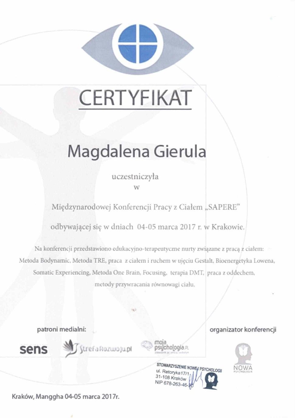 Posiadam certyfikat specjalisty psychoterapii uzależnień oraz stale poszerzam swoją wiedzę, uczestnicząc w licznych szkoleniach i kursach, które pozwalają mi jeszcze skuteczniej wspierać osoby przeżywające trudności psychiczne. Obecnie kończę szkolenie psychoterapeutyczne w nurcie humanistyczno-doświadczalnym. Dla mnie psychoterapia to nie tylko praca, ale przede wszystkim pasja – pomóc drugiemu człowiekowi odkryć jego wewnętrzne zasoby, które pozwalają na uzdrowienie i rozwój.