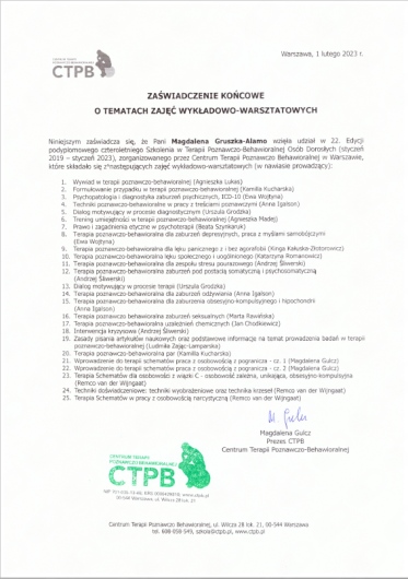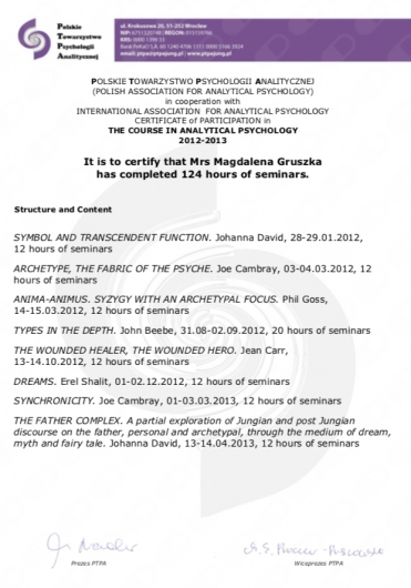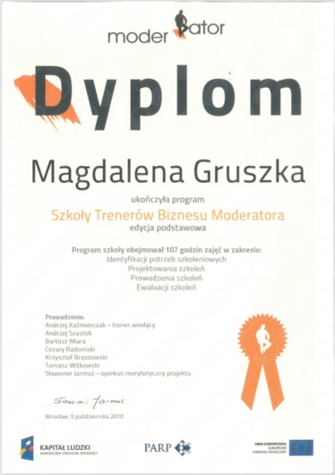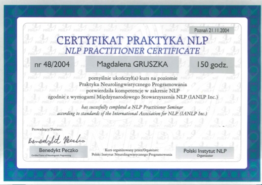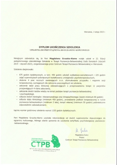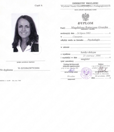 Certyfikowany Psychoterapeuta Poznawczo-Behawioralny, Trener Biznesu oraz Coach. Posiada 11-letnie doświadczenie w psychoterapii indywidualnej oraz par, a także w pracy z młodzieżą. Poza pracą psychoterapeutyczną od 18 lat projektuje oraz realizuje szkolenia miękkie i warsztaty rozwojowe z zakresu komunikacji interpersonalnej, rekrutacji, coachingu, oceniania, motywowania, zarządzania zespołem, wystąpień publicznych, zarządzania czasem, rozwiązywania konfliktów, twórczości, wywierania wpływu, radzenia sobie ze stresem, rozwiązywania problemów i asertywności. Wykładała na studiach stacjonarnych oraz podyplomowych Wyższej Szkoły Handlowej oraz Wyższej Szkoły Bankowej psychologię zarządzania, coaching oraz zarządzanie zasobami ludzkimi. Ukończyła z wyróżnieniem studia dzienne Uniwersytetu Wrocławskiego na kierunku Psychologia, 4-letnie szkolenie z zakresu psychoterapii poznawczo-behawioralnej CTPB (ośrodku akredytowanym przez Ministerstwo Zdrowia ), Szkołę Trenerów Biznesu Moderatora oraz Studium ZZL. Posiada szkolenia z zakresu terapii schematu, psychoanalizy jungowskiej i mediacji oraz performance coaching’u, negocjacji, a także zarządzania rozwojem pracowników. Stypendystka na East Carolina University w Stanach Zjednoczonych na programie Master of Industrial / Organizational Psychology oraz dyplomowany Praktyk NLP. Prowadzi psychoterapię zarówno w języku polskim, po angielsku, a także po hiszpańsku."