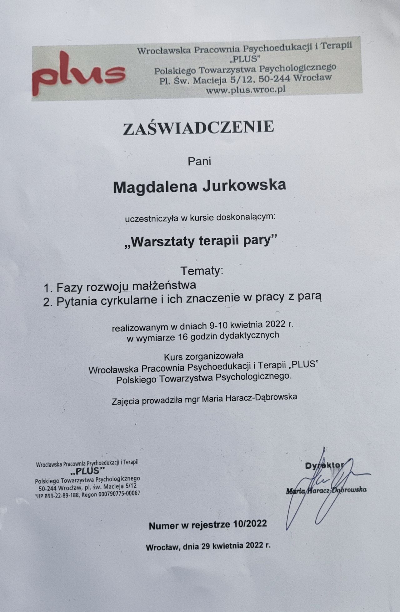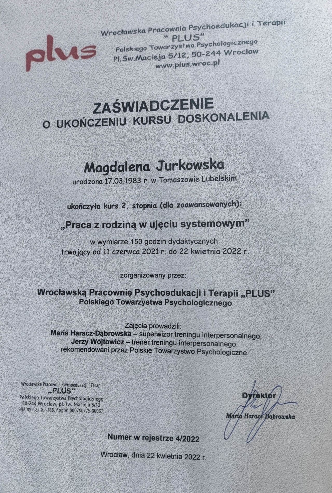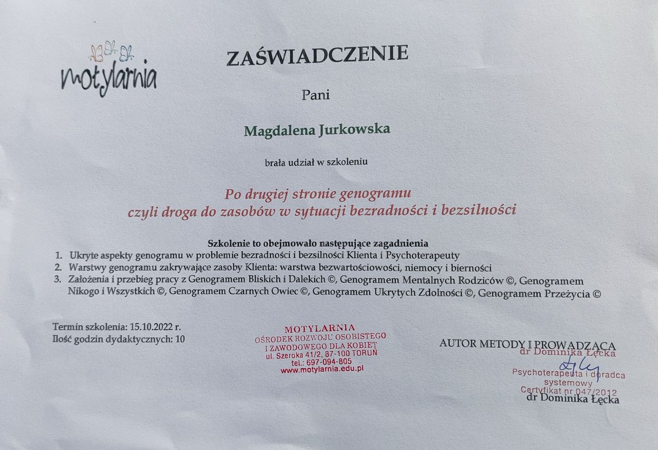 Ukończyłam studia magisterskie w KUL ze specjalnością psychologia kliniczna, osobowości i terapii psychologicznej. Ukończyłam także kurs pracy z rodziną w ujęciu systemowym. Nieustannie podnoszę swoje kompetencje uczestnicząc w licznych kursach i szkoleniach.