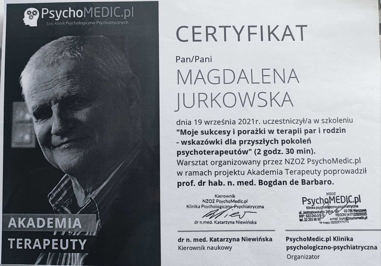 Jaki jest zakres porad oferowanych przez Magdalena Jurkowska?Magdalena Jurkowska to psycholog. Na podstawie swojego doświadczenia i wykształcenia Magdalena Jurkowska oferuje usługi takie jak: interwencja kryzysowa, Konsultacja psychologiczna, psychoterapia rodzinna, psychoterapia par i małżeństw, Konsultacja psychologiczna online, konsultacja psychologiczna dzieci, terapia par, konsultacja psychologiczna młodzieży, Diagnoza ADHD, terapia rodzinna.