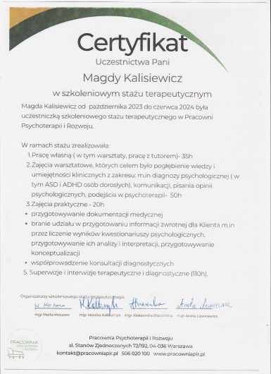 Czy Magdalena Kalisiewicz przyjmuje online, bez konieczności pojawiania się w placówce?Tak, Magdalena Kalisiewicz oferuje konsultacje online. Wybierz opcję „konsultacja online” przy umawianiu wizyty, a zobaczysz dostępne terminy.
