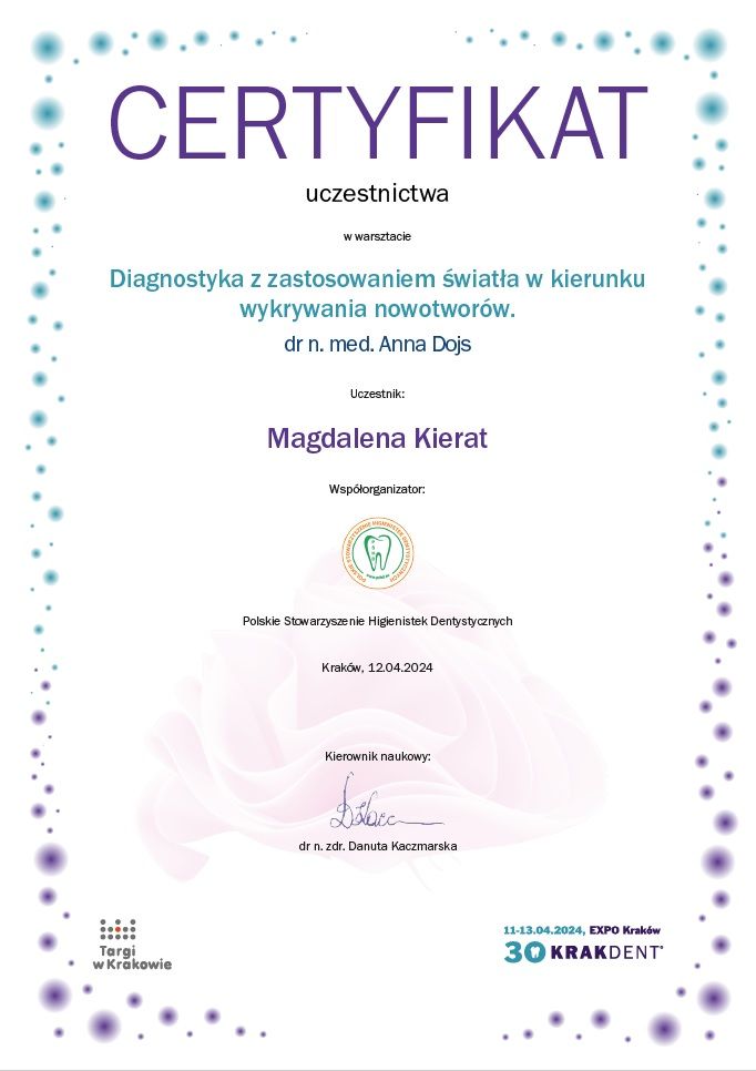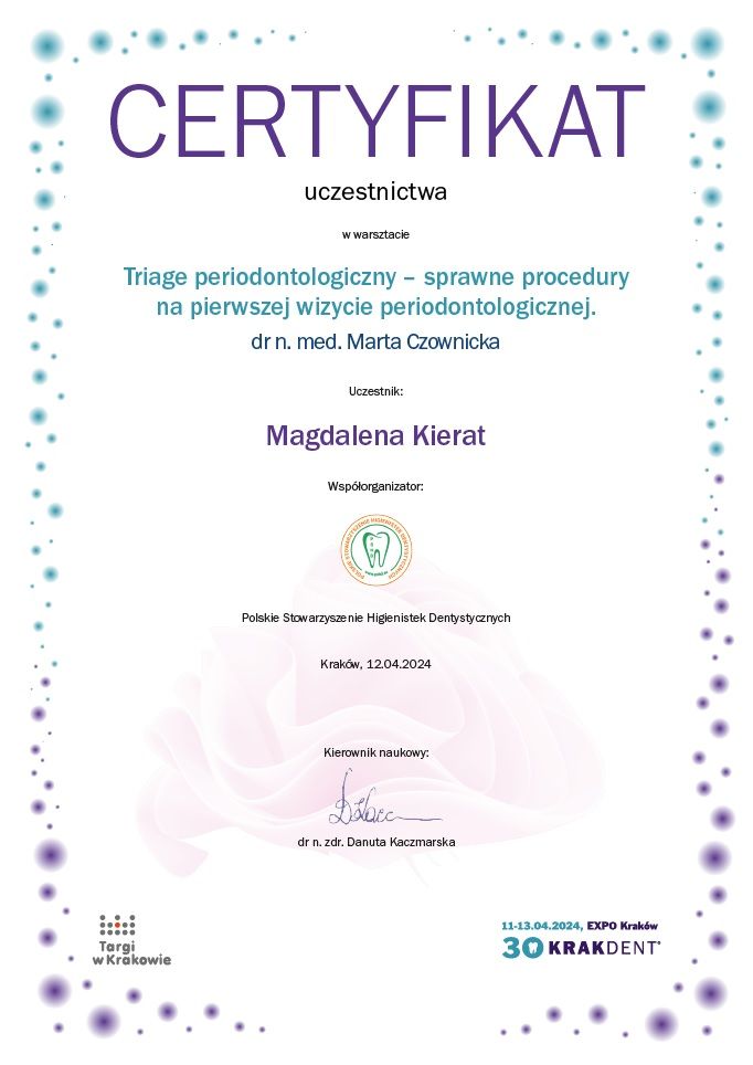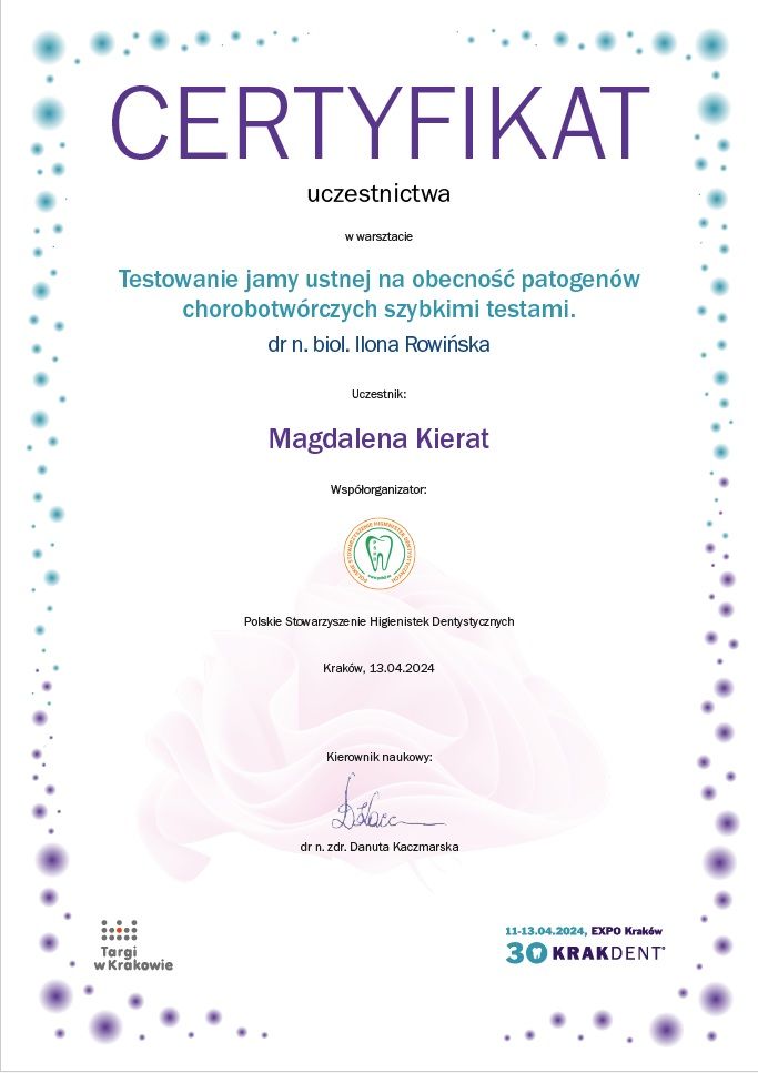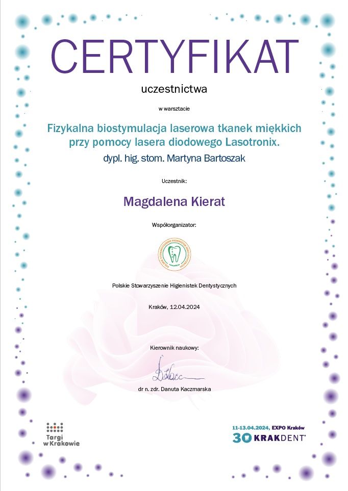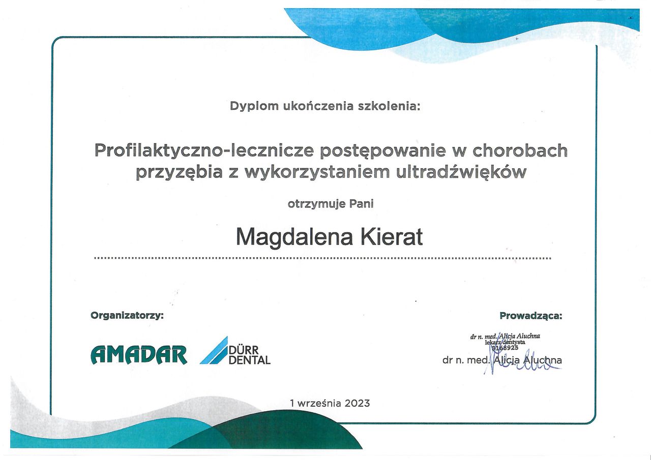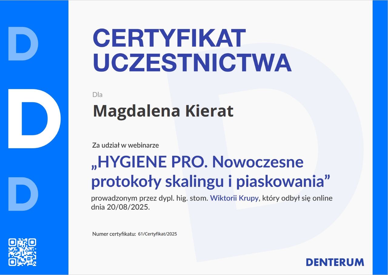 Z całego serca polecam! Pani Maga jest niezwykle profesjonalna, delikatna i dokładna. Zabieg przebiegł bezboleśnie, w bardzo miłej atmosferze. Wszystko zostało dokładnie wyjaśnione, a po wizycie dostałam konkretne zalecenia dotyczące dalszej pielęgnacji jamy ustnej. Widać, że Pani Magda ma ogromną wiedzę i pasję do swojej pracy.