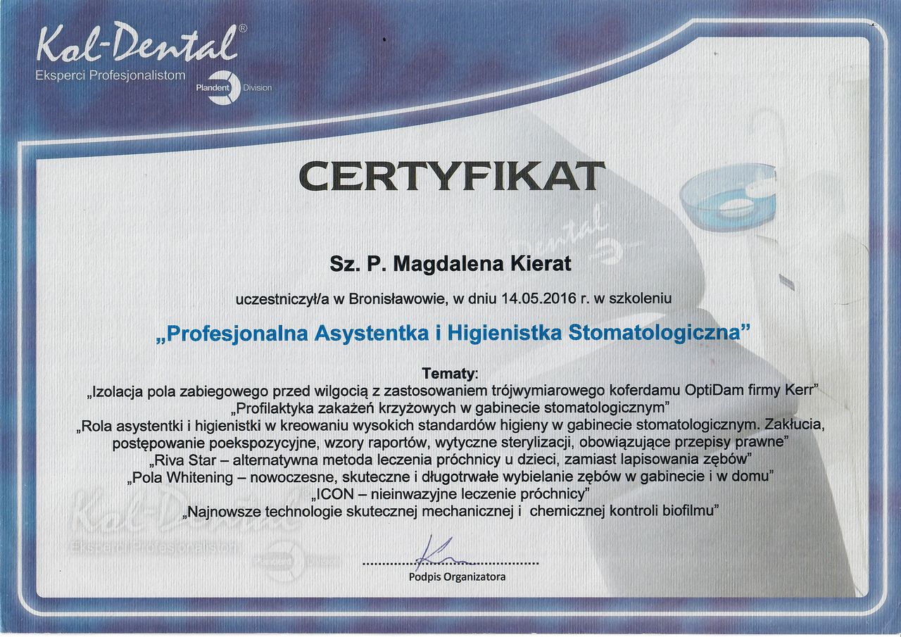 Bardzo ważne jest aby pacjent w gabinecie czuł się komfortowo. Zawsze krok po kroku wyjaśniam na czym polega dany zabieg i jakie są jego korzyści dla naszego organizmu. Dodatkowo na koniec każdej wizyty przeprowadzam instruktaż higieny jamy ustnej dostosowany do indywidualnych potrzeb pacjenta. Ma on za zadanie uświadomić jak ważną rolę w utrzymaniu zdrowej jamy ustnej spełnia prawidłowe szczotkowanie i nitkowanie zębów oraz przestrzeganie właściwych nawyków żywieniowych. Pomagam również dobrać akcesoria niezbędne do utrzymania prawidłowej higieny jamy ustnej, aby pacjent cieszył się pięknym uśmiechem przez długie lata.