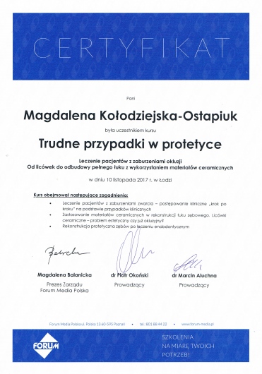 Jaki jest zakres porad oferowanych przez Magdalena Kołodziejska-Ostapiuk?Magdalena Kołodziejska-Ostapiuk to stomatolog. Na podstawie swojego doświadczenia i wykształcenia Magdalena Kołodziejska-Ostapiuk oferuje usługi takie jak: konsultacja protetyczna, Konsultacja stomatologiczna, Wypełnienie, korony pełnoceramiczne, korony, licówki, wkłady koronowo-korzeniowe.