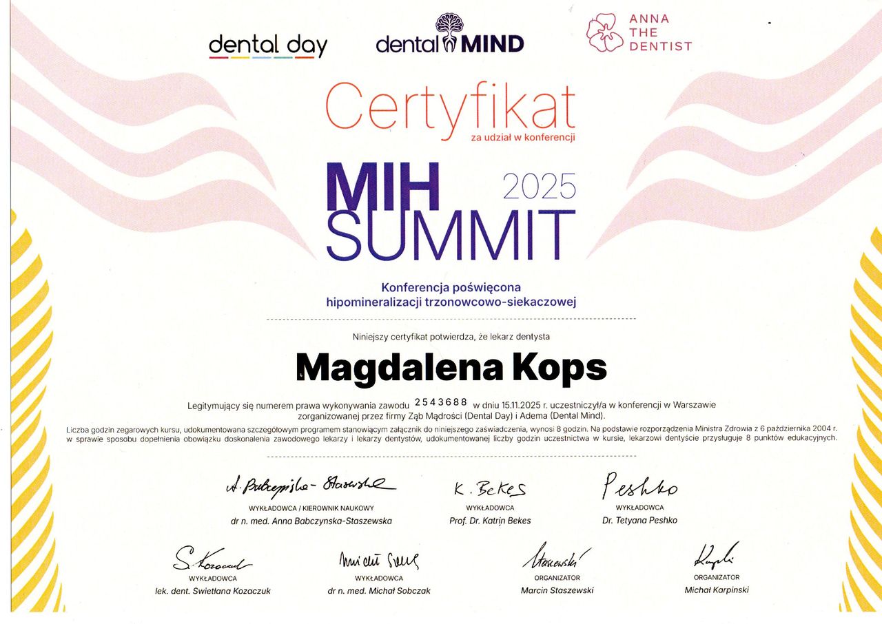 Od 2019 roku leczeniu dzieci poświęca się bezgranicznie. Wykonuje zabiegi w bezbolesnym ZNIECZULENIU KOMPUTEROWYM, GAZIE ROZWESELAJĄCYM, NARKOZIE. Szczęśliwa mama dwójki dzieci. Posiada nieograniczone pokłady CIERPLIWOŚCI.