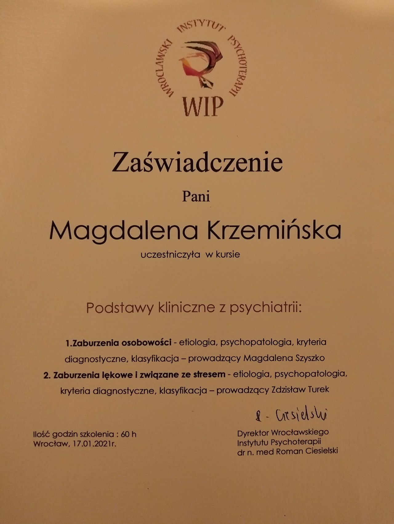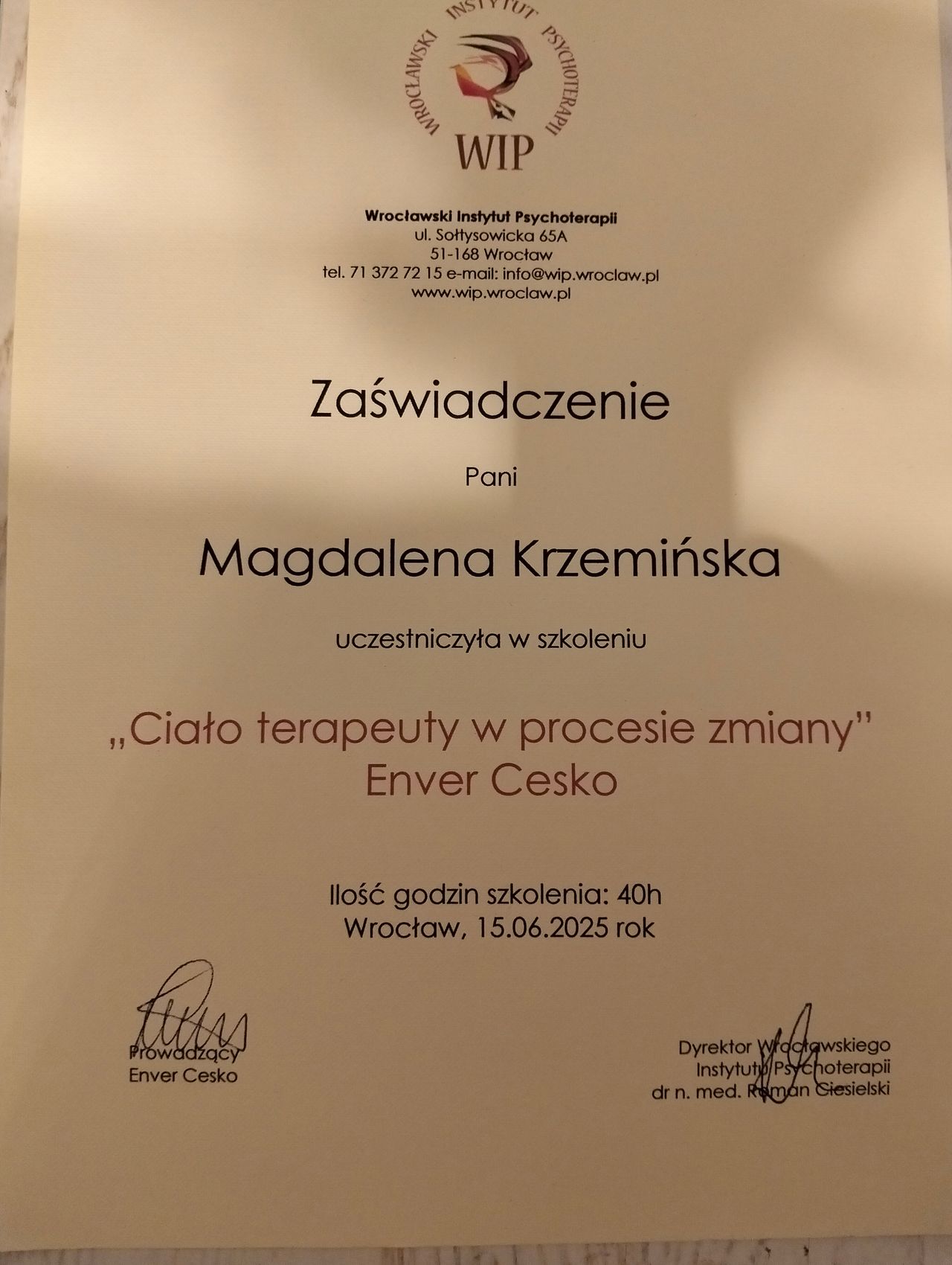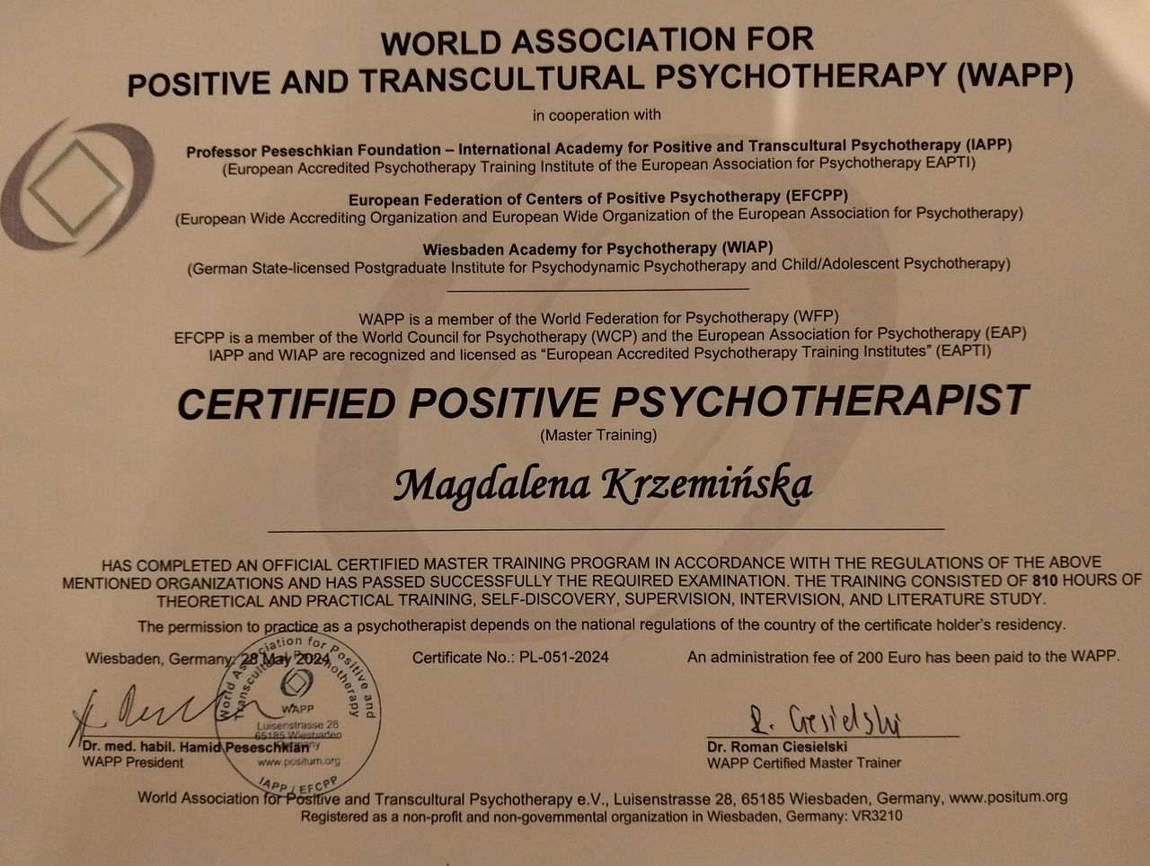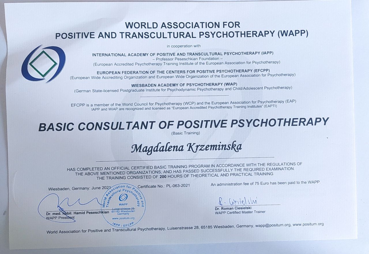 Jestem Certyfikowaną Psychoterapeutką z Międzynarodowymi Certyfikatami Psychoterapii Pozytywnej Transkulturowej wydanymi przez WAPP - World Association for Positive and Transcultural Psychotherapy z tytułu ukończenia podyplomowych kursów psychoterapii na poziomach podstawowym i mistrzowskim (Basic Training & Master Training). Całościowe podyplomowe 4-letnie szkolenie z psychoterapii ukończyłam we Wrocławskim Instytucie Psychoterapii, gdzie odbyłam również kursy z psychiatrii klinicznej w zakresie zaburzeń związanych ze stresem, zaburzeń lękowych, pracy z ciałem i zaburzeń osobowości, a obecnie kontynuuję zdobywanie wiedzy w ramach szkoleń z kolejnych nurtów psychoterapeutycznych - ericksonowskiego i systemowego. Jestem członkiem Polskiego Towarzystwa Psychoterapii Stosowanej oraz Światowego Stowarzyszenia Psychoterapii Pozytywnej Transkulturowej. Moją pracę poddaję superwizji. Jestem również Certyfikowaną Hipnoterapeutką po Akademii Hipnoterapii w Stanach Zjednoczonych oraz Dyplomowanym Coachem - absolwentką studiów podyplomowych o kierunku Akademia Coachingu z programem akredytowanym przez Izbę Coachingu w Wyższej Szkole Bankowej w Gdańsku. Ukończyłam dwa fakultety studiów wyższych - na Uniwersytecie Mikołaja Kopernika w Toruniu oraz w Wyższej Szkole Lingwistycznej w Częstochowie. Pracuję w nurcie integracyjnym obejmującym kilka głównych szkół psychoterapii. Ważne miejsce zajmuje tu Psychoterapia Pozytywna Transkulturowa (PPT), akredytowana przez największe europejskie i światowe organizacje zrzeszające szkoły psychoterapii takie jak: Międzynarodową Federację Psychoterapii (IFP)