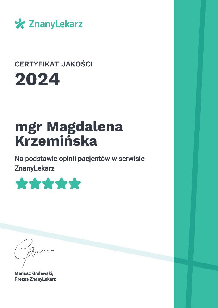 oraz posiadająca uprawnienia European Wide Accrediting Organization (EWAO) i akredytację World Certificate of Psychotherapy.