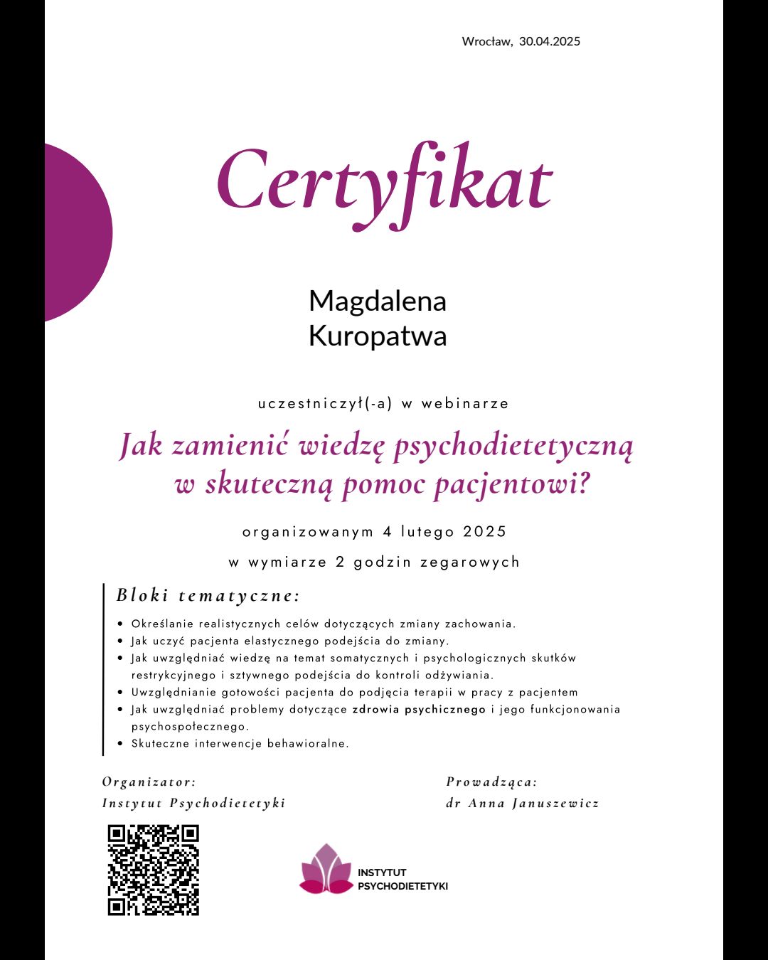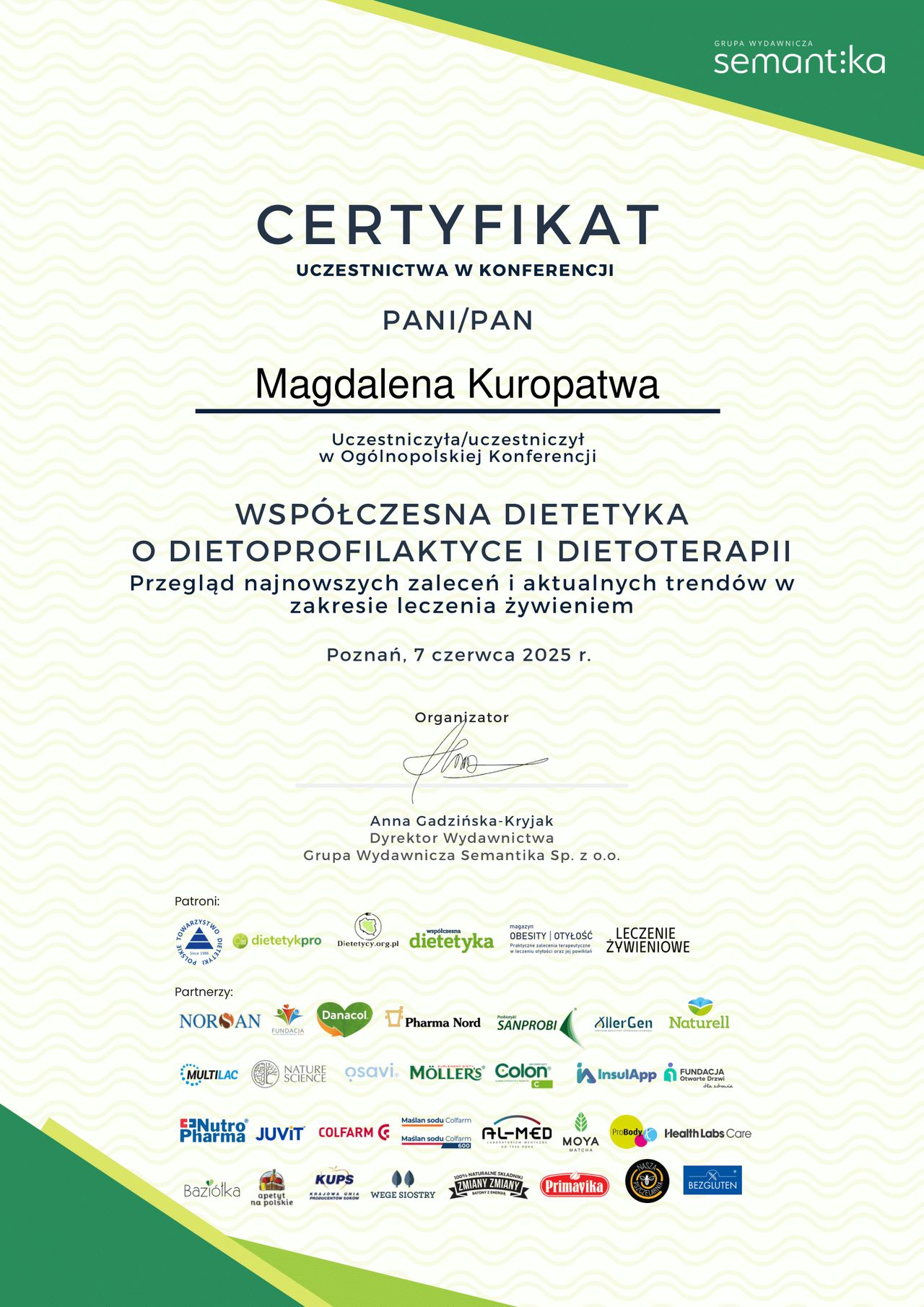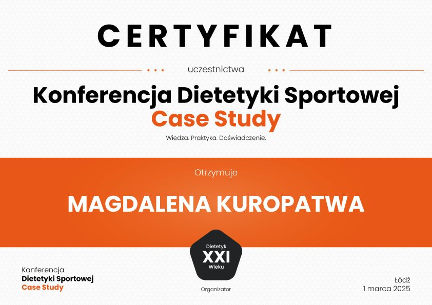 Stale poszerzam swoją wiedzę, uczestnicząc w szkoleniach, konferencjach i kursach z zakresu dietetyki klinicznej, psychodietetyki i dietetyki sportowej.