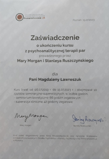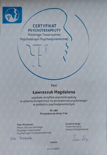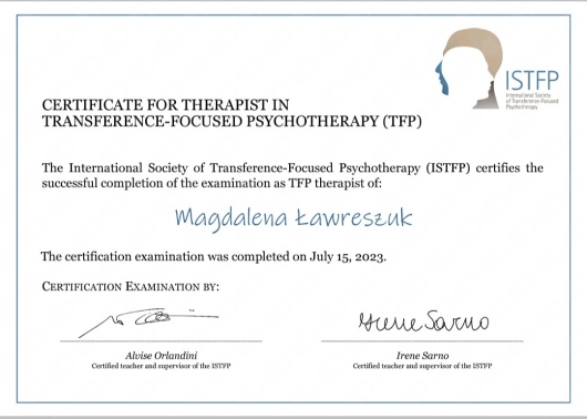 Ukończyłam psychologię na Uniwersytecie im. Adama Mickiewicza w Poznaniu. Dyplom psychoterapeuty uzyskałam w ramach czteroletniej Szkoły Psychoterapii Psychodynamicznej w Krakowskim Centrum Psychodynamicznym, rekomendowanym przez Polskie Towarzystwo Psychologiczne oraz Polskie Towarzystwo Psychoterapii Psychodynamicznej. Posiadam certyfikat psychoterapeuty PTPPd oraz certyfikat psychoterapeuty Psychoterapii Skoncentrowanej na Przeniesieniu (TFP) w ramach International Society of Transferencje-Focused Psychotherapy (ISTFP). Metoda TFP charakteryzuje się wysoką skutecznością i pomaga uzyskać trwałą zmianę w strukturze osobowości. Ponadto doskonalę swój warsztat pracy w metodzie pracy z parami wg Tavistock Relationships oraz Psychoterapii Skoncentrowanej na Przeniesieniu O. Kernberga. Uzyskałam również Certyfikat Terapeuty Środowiskowego oraz Certyfikat Trenera Zastępowania Agresji. Postępuję zgodnie z kodeksem etycznym psychologa i psychoterapeuty. Swoją pracę regularnie poddaję superwizji u superwizorów w Polsce i za granicą.