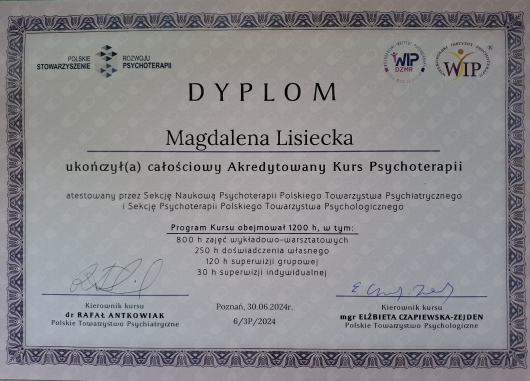 Pracuję indywidualnie z osobami dorosłymi. Jestem psychologiem i psychoterapeutą w trakcie procesu certyfikacji. Ukończyłam studia magisterskie na kierunku psychologia - specjalność psychologia kliniczna na Uniwersytecie im. A. Mickiewicza w Poznaniu, a także pięcioletni Kurs Psychoterapii w Wielkopolskim Instytucie Psychoterapii, który posiada akredytację Polskiego Towarzystwa Psychologicznego oraz jest atestowany przez Polskie Towarzystwo Psychiatryczne (nr dyplomu: 6/3P/2024). Jestem absolwentką studiów podyplomowych w zakresie Pomocy Psychologicznej w Dziedzinie Seksuologii, ukończyłam również Kurs Dokształcający w Zakresie Przygotowania Pedagogicznego. Nieustająco staram się rozwijać swoje umiejętności i poszerzać warsztat pracy poprzez udział w szkoleniach i konferencjach, które dotyczą psychologii, psychoterapii i seksualności.