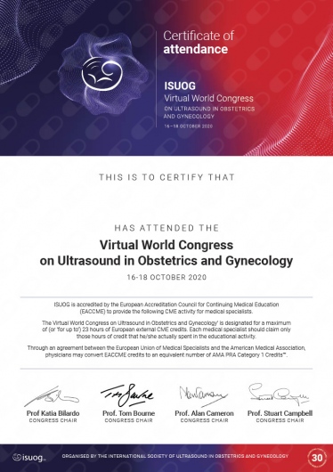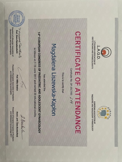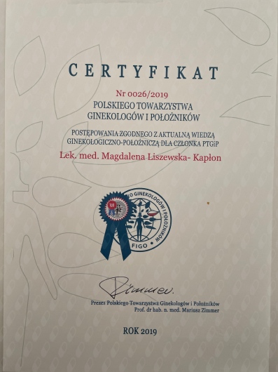 Posiadam Certyfikat podstawowy Sekcji USG PTG w zakresie wykonywania badań ultrasonograficznych w Położnictwie i Ginekologii oraz certyfikat FMF uprawniający do wykonywania badań prenatalnych z wyliczeniem ryzyka aberracji chromosomowych u płodu