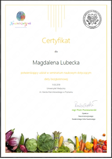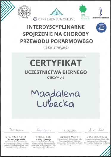 Ukończyłam studia licencjackie i magisterskie na Uniwersytecie Medycznym w Poznaniu. Doświadczenie zawodowe zdobywałam podczas licznych praktyk w poznańskich klinikach, przychodniach i poradniach. W trakcie studiów działałam w Studenckim Kole Naukowym Gastroenterologii i Dietetyki, gdzie w ramach projektu badawczego współpracowałam z pacjentami z nieswoistymi chorobami zapalnymi jelit oraz uczestniczyłam w wielu akcjach promujących zdrowy styl życia. Przez 1,5 roku pracowałam jako dietetyk w Klinice Neonatologii Ginekologiczno-Położniczego Szpitala Klinicznego UM w Poznaniu.