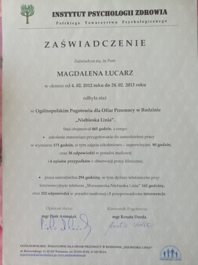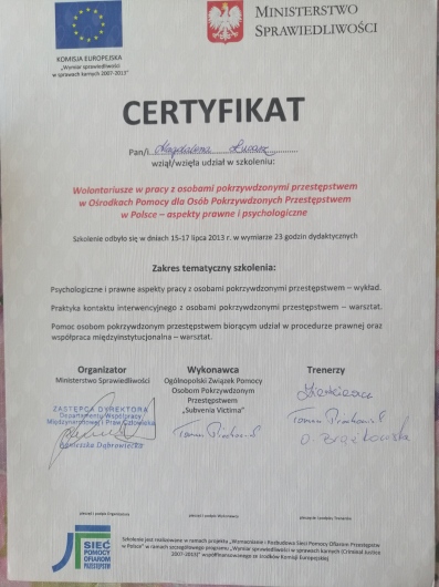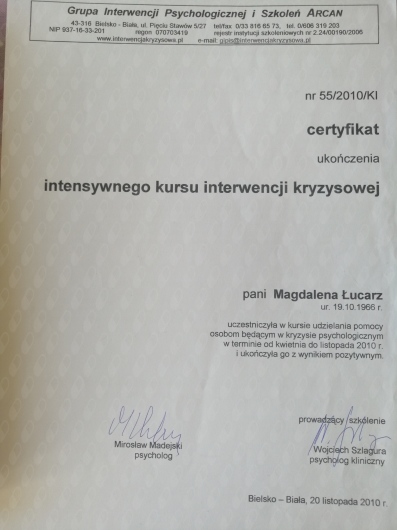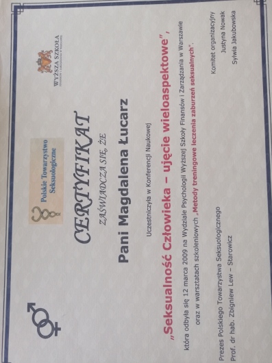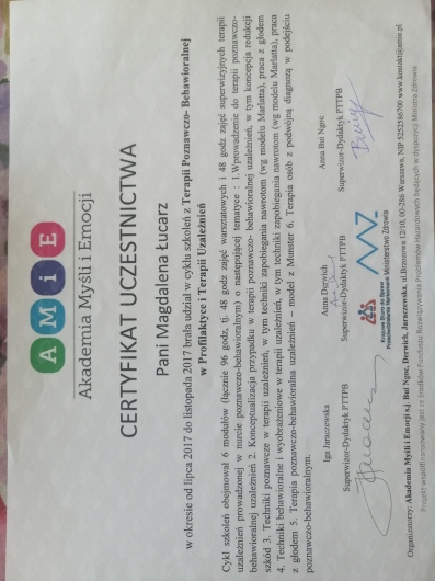 Skończyłam 2-lenią Szkołę Psychoterapii Osób z Problem Uzależnienia przy Laboratorium Psychoedukacji w Warszawie.