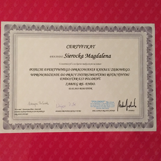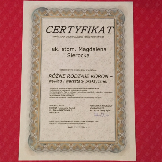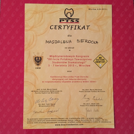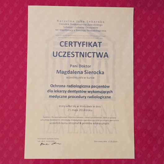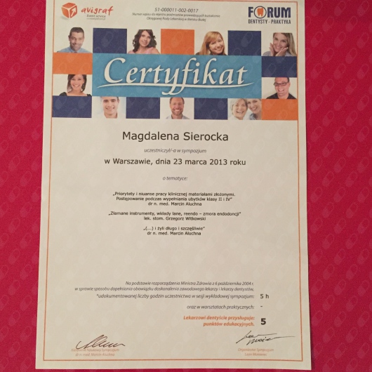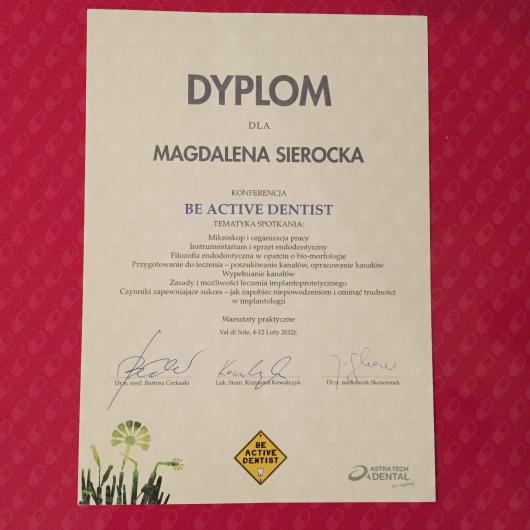 Cały czas pogłębiam swoją wiedzę uczestnicząc w licznych kursach i konferencjach stomatologicznych.