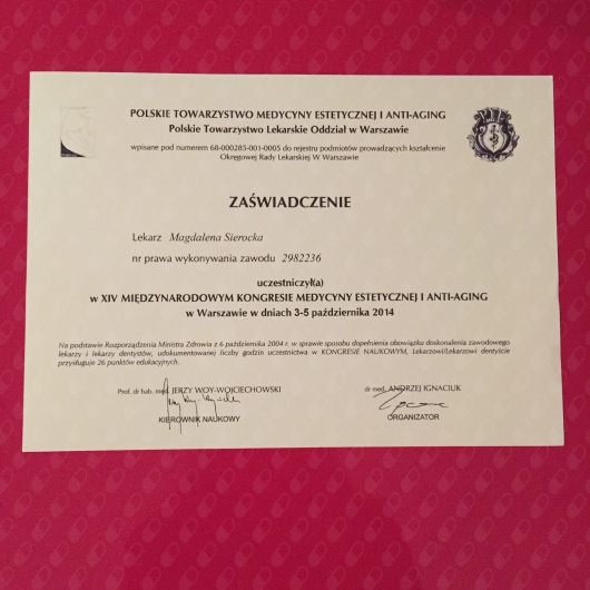 Obecnie jestem w trakcie Studiów Podyplomowych z zakresu Medycyny Estetycznej na Warszawskim Uniwersytecie Medycznym.